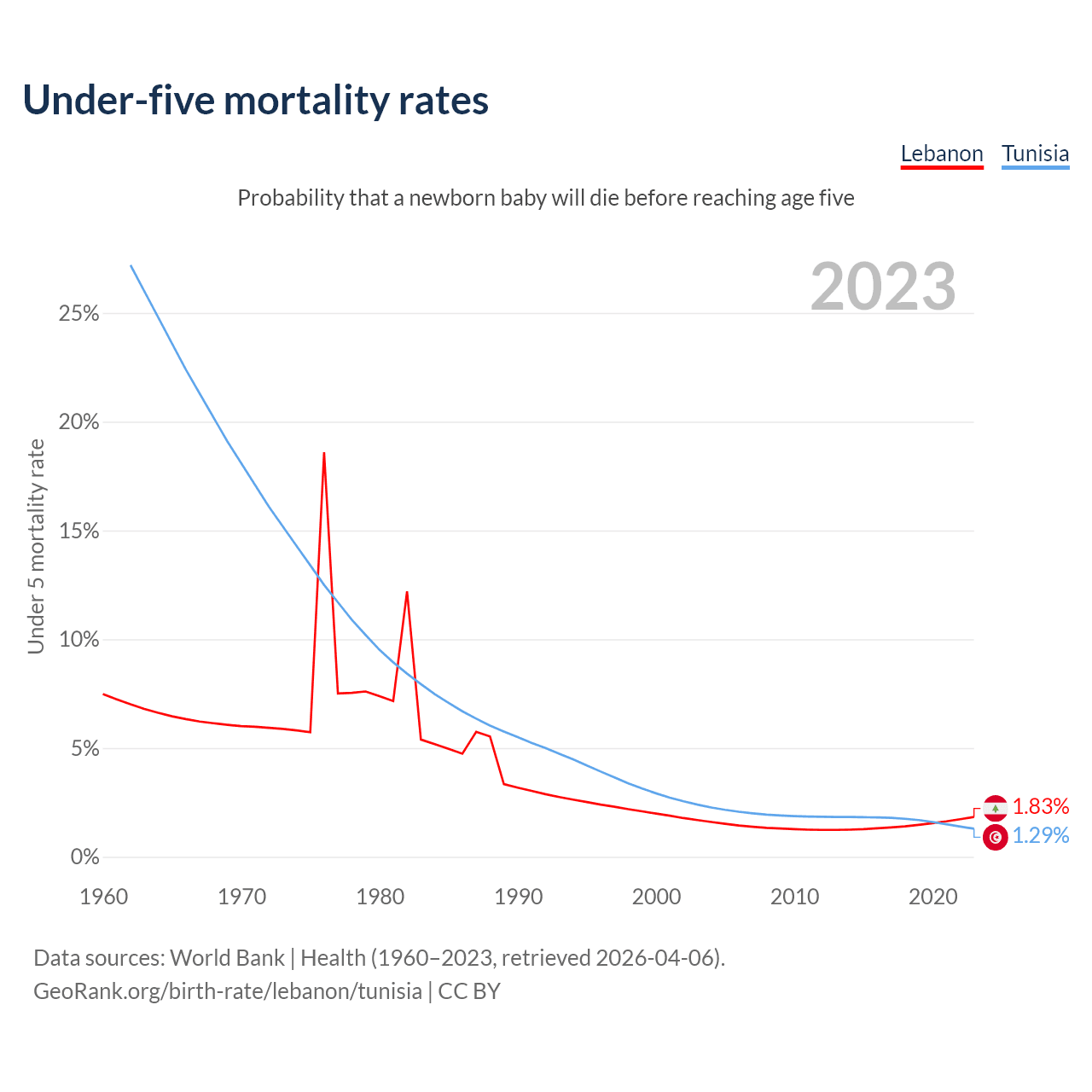 The chance that a newborn baby will die before reaching age five is 1.83% in Lebanon and 1.29% in Tunisia. Above is a chart with historical data on under-five mortality rates.