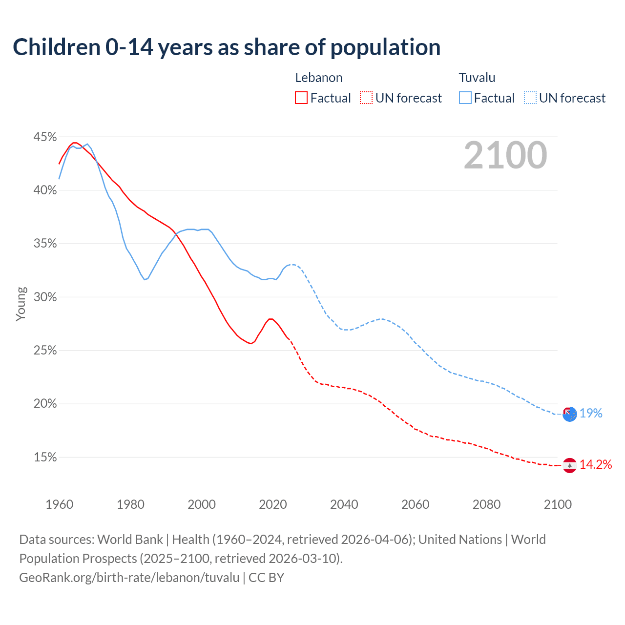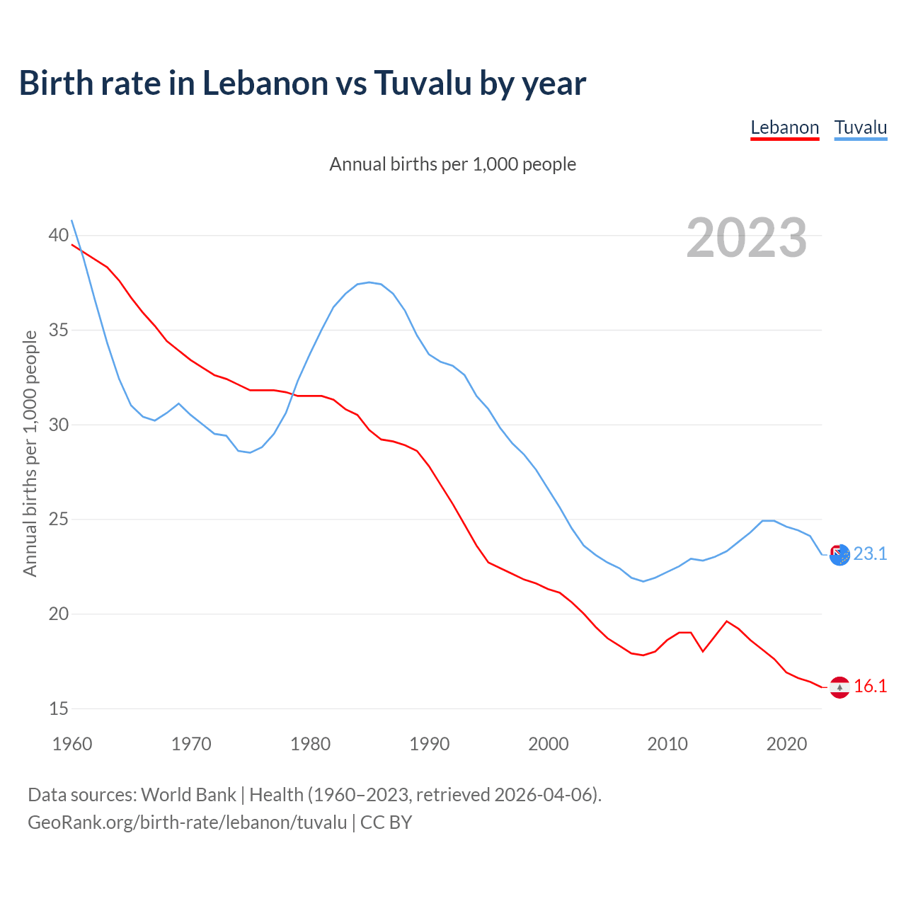 Lebanon has an annual birth rate of 16.1 births per 1,000 people, compared to 23.1 for Tuvalu. The average number of children a woman is expected to have during her lifetime — the fertility rate, is 2.24 in Lebanon and 3.21 in Tuvalu — 43.3% difference.