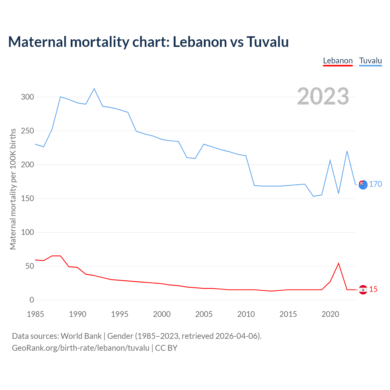 The maternal mortality rate, which is the probability of dying during childbirth or within 42 days of pregnancy termination, is 15 deaths per 100,000 live births in Lebanon, compared to 170 deaths in Tuvalu.