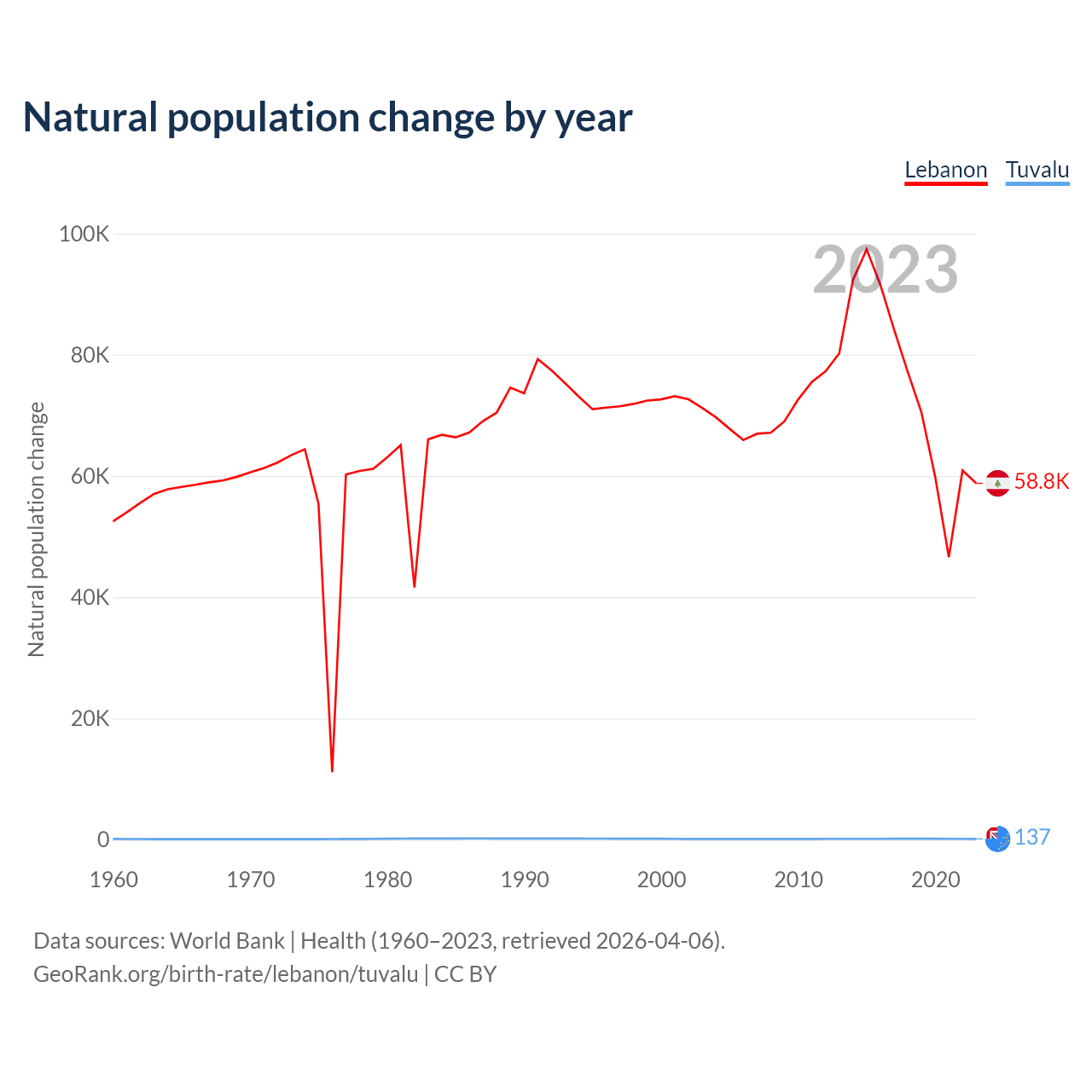 According to the latest available data on birth rates, the fertility rate in Lebanon was 2.24 children per woman in 2023, compared to 3.21 in Tuvalu in 2023. The replacement level is considered to be 2.1 children per woman.