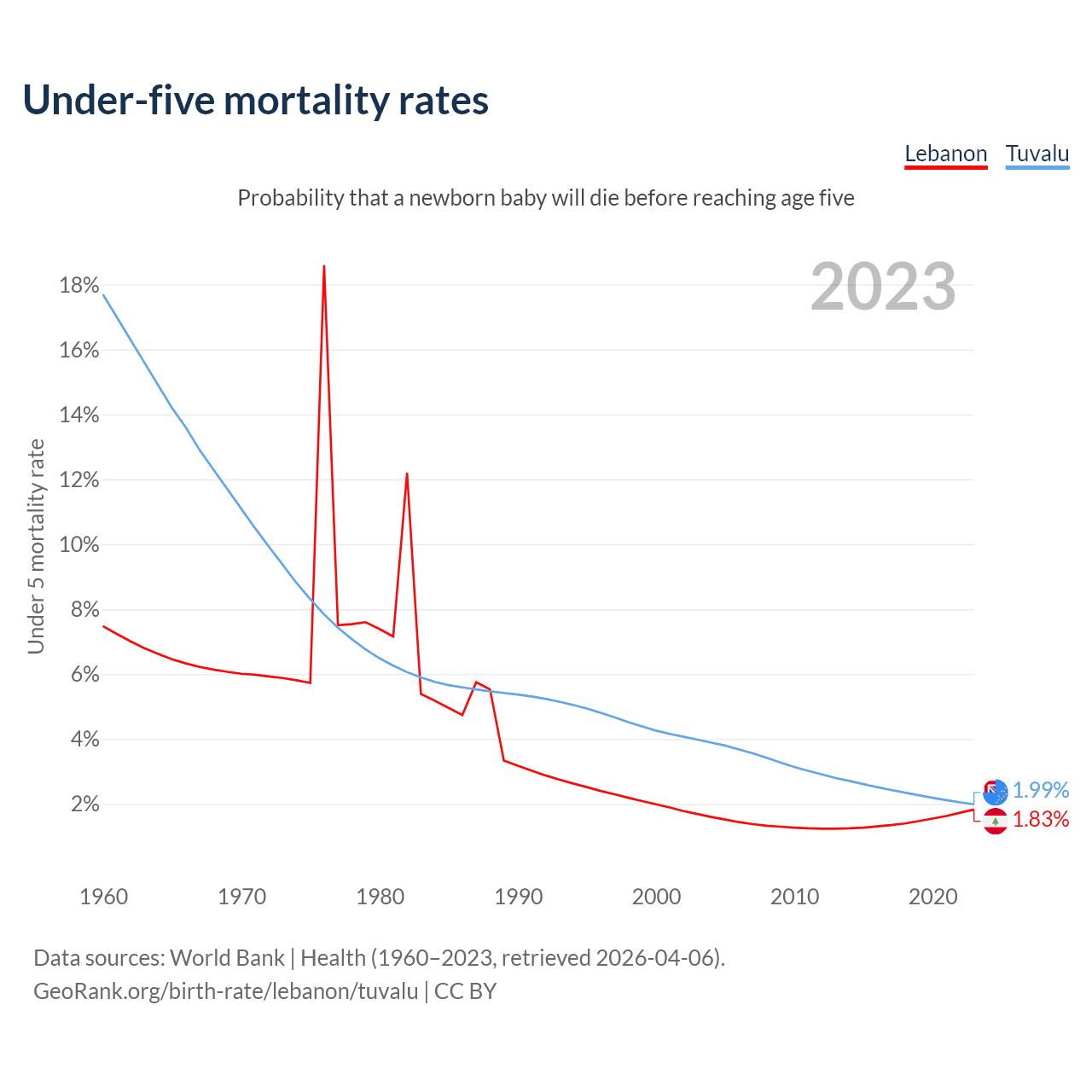 The chance that a newborn baby will die before reaching age five is 1.83% in Lebanon and 1.99% in Tuvalu. Above is a chart with historical data on under-five mortality rates.