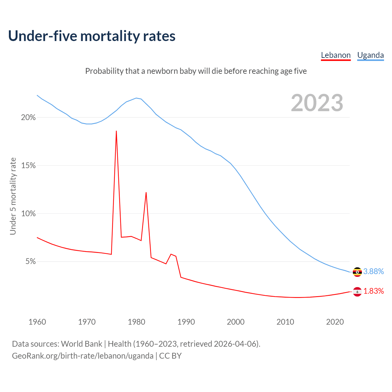 The chance that a newborn baby will die before reaching age five is 1.83% in Lebanon and 3.88% in Uganda. Above is a chart with historical data on under-five mortality rates.