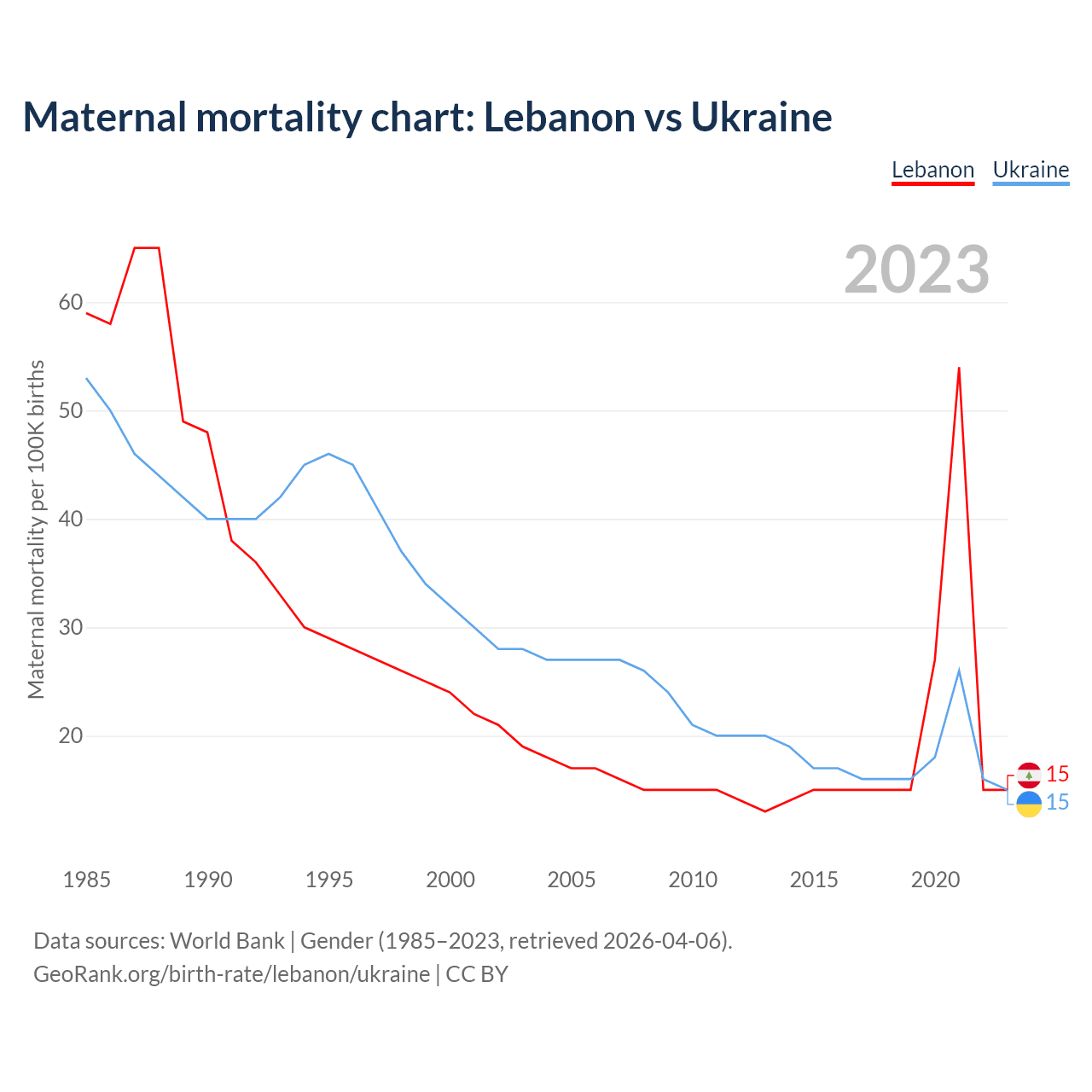 The maternal mortality rate, which is the probability of dying during childbirth or within 42 days of pregnancy termination, is 15 deaths per 100,000 live births in Lebanon, compared to 15 deaths in Ukraine.