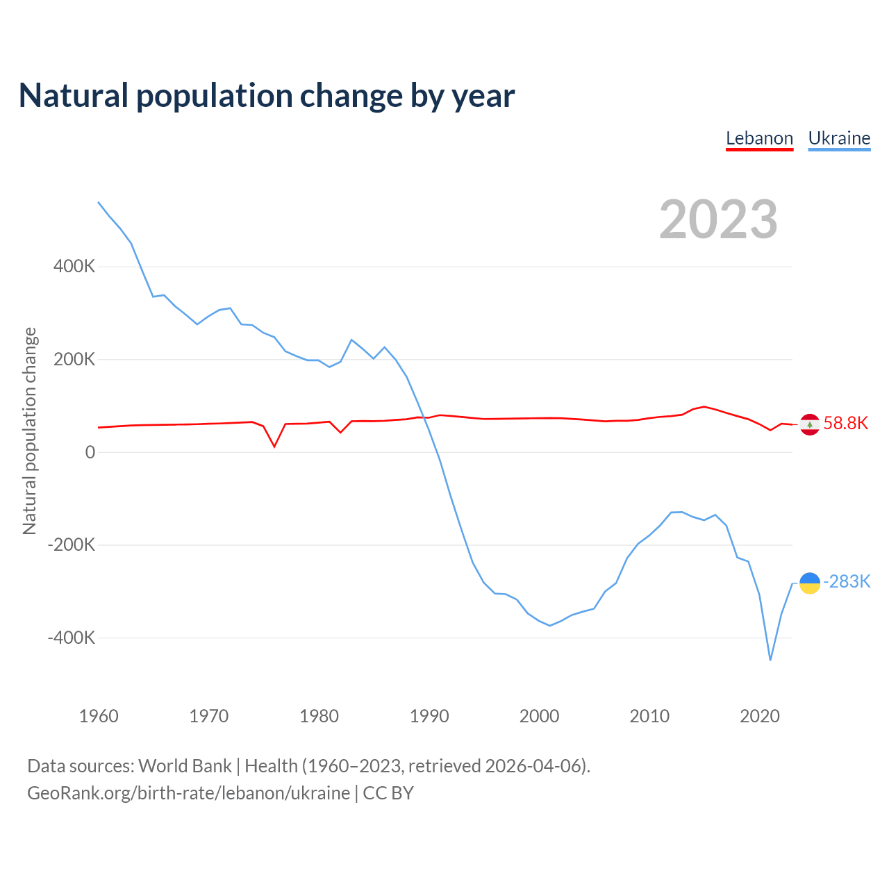 According to the latest available data on birth rates, the fertility rate in Lebanon was 2.24 children per woman in 2023, compared to 0.98 in Ukraine in 2023. The replacement level is considered to be 2.1 children per woman.