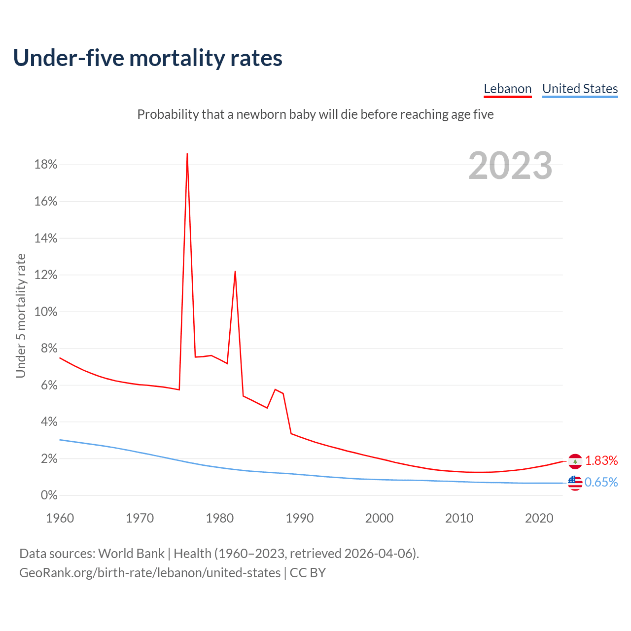 The chance that a newborn baby will die before reaching age five is 1.83% in Lebanon and 0.65% in the United States. Above is a chart with historical data on under-five mortality rates.