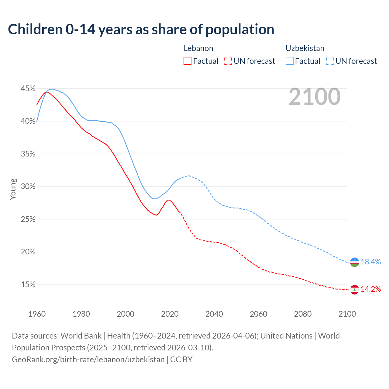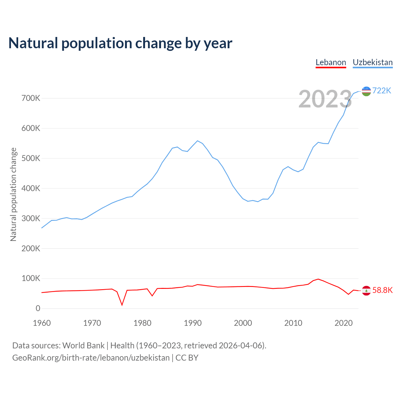 Lebanon has an annual birth rate of 16.1 births per 1,000 people, compared to 26.5 for Uzbekistan. The average number of children a woman is expected to have during her lifetime — the fertility rate, is 2.24 in Lebanon and 3.5 in Uzbekistan — 56.3% difference.