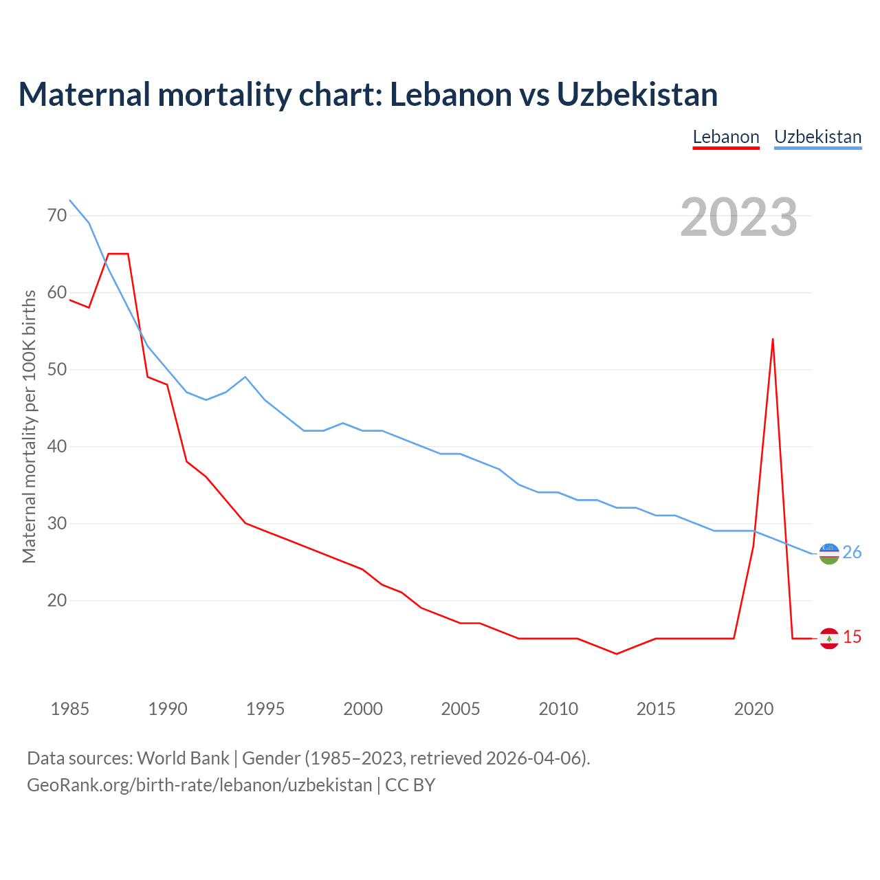 The maternal mortality rate, which is the probability of dying during childbirth or within 42 days of pregnancy termination, is 15 deaths per 100,000 live births in Lebanon, compared to 26 deaths in Uzbekistan.