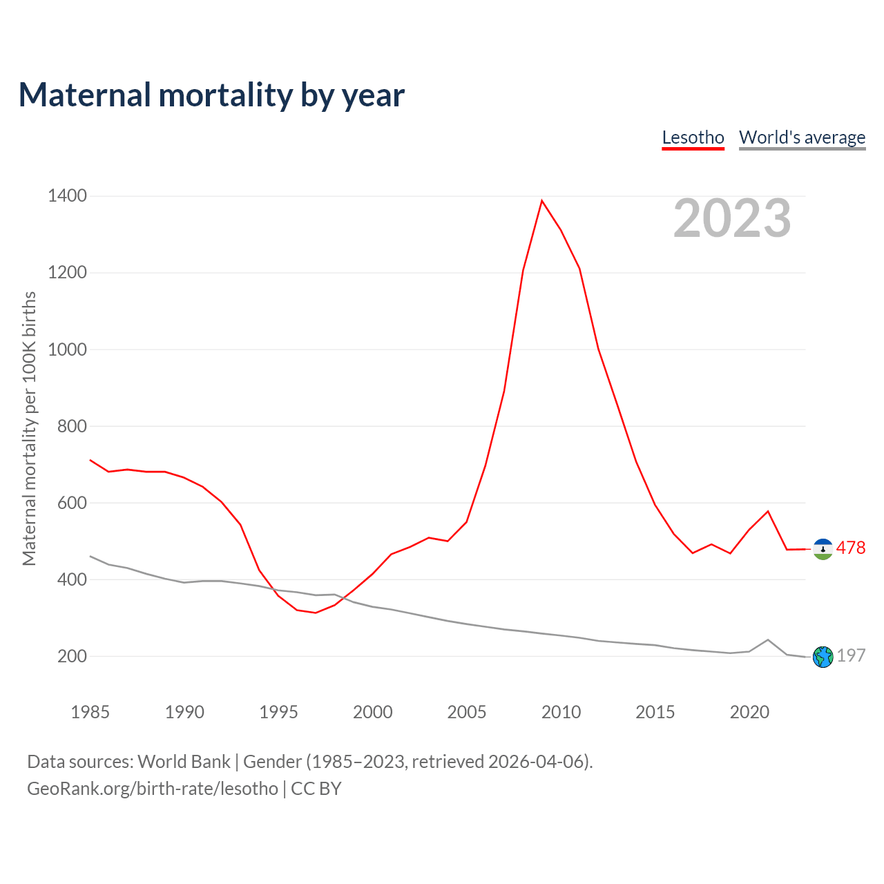 The maternal mortality rate in Lesotho was 478 deaths per 100,000 live births in 2023 — a 0.48% chance of dying during childbirth or within 42 days of pregnancy termination. This is a 15.7% increase compared to the year 2000.
