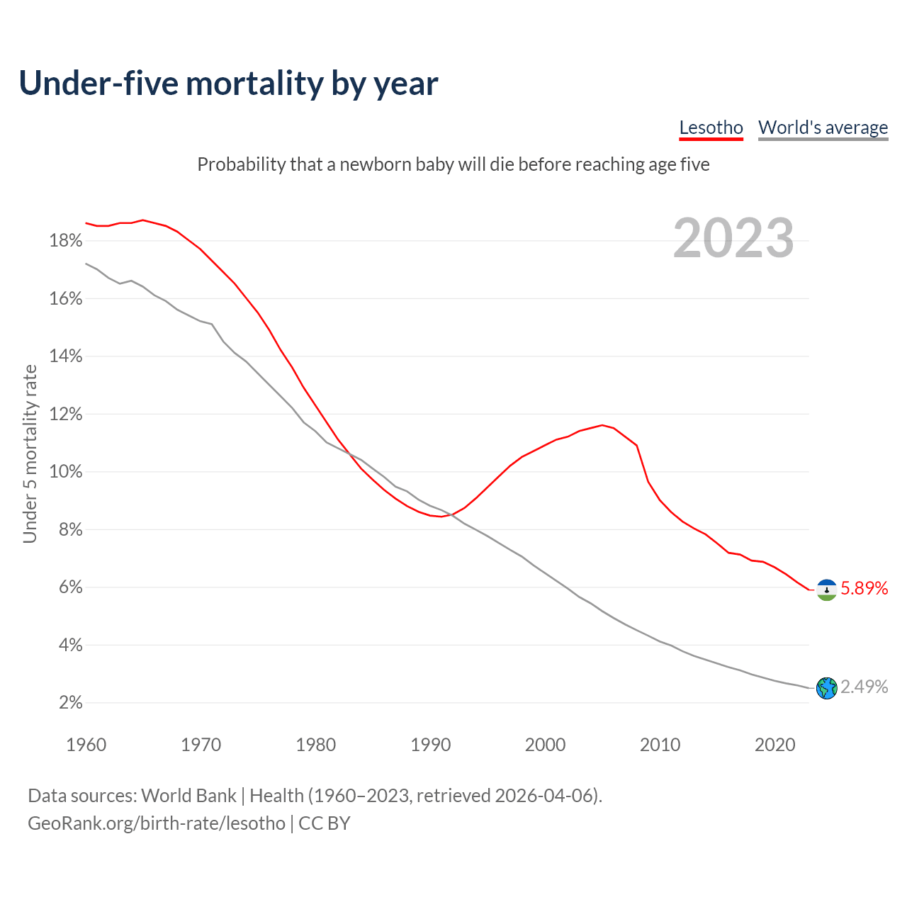 The under-5 mortality rate in Lesotho was 58.9 deaths per 1,000 live births in 2023 — a 5.89% chance that a newborn baby will die before reaching age five. This is down from 109.4 deaths per 1,000 live births in 2000.