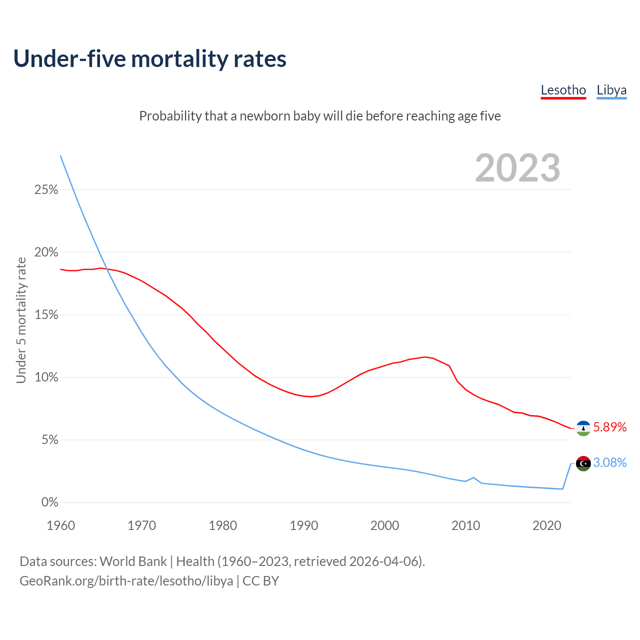 The chance that a newborn baby will die before reaching age five is 5.89% in Lesotho and 3.08% in Libya. Above is a chart with historical data on under-five mortality rates.