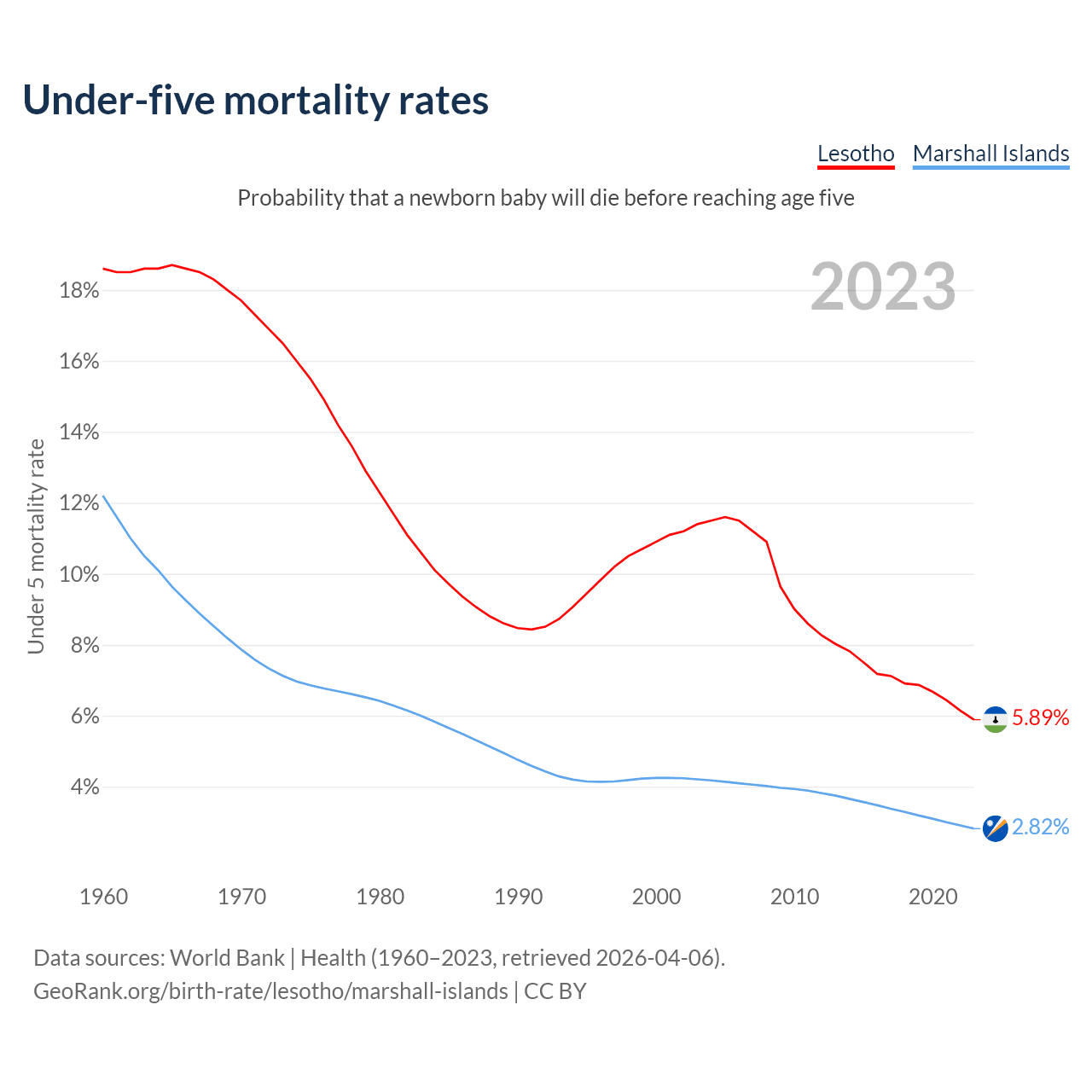 The chance that a newborn baby will die before reaching age five is 5.89% in Lesotho and 2.82% in the Marshall Islands. Above is a chart with historical data on under-five mortality rates.