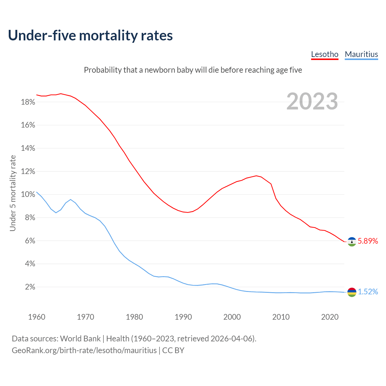 The chance that a newborn baby will die before reaching age five is 5.89% in Lesotho and 1.52% in Mauritius. Above is a chart with historical data on under-five mortality rates.