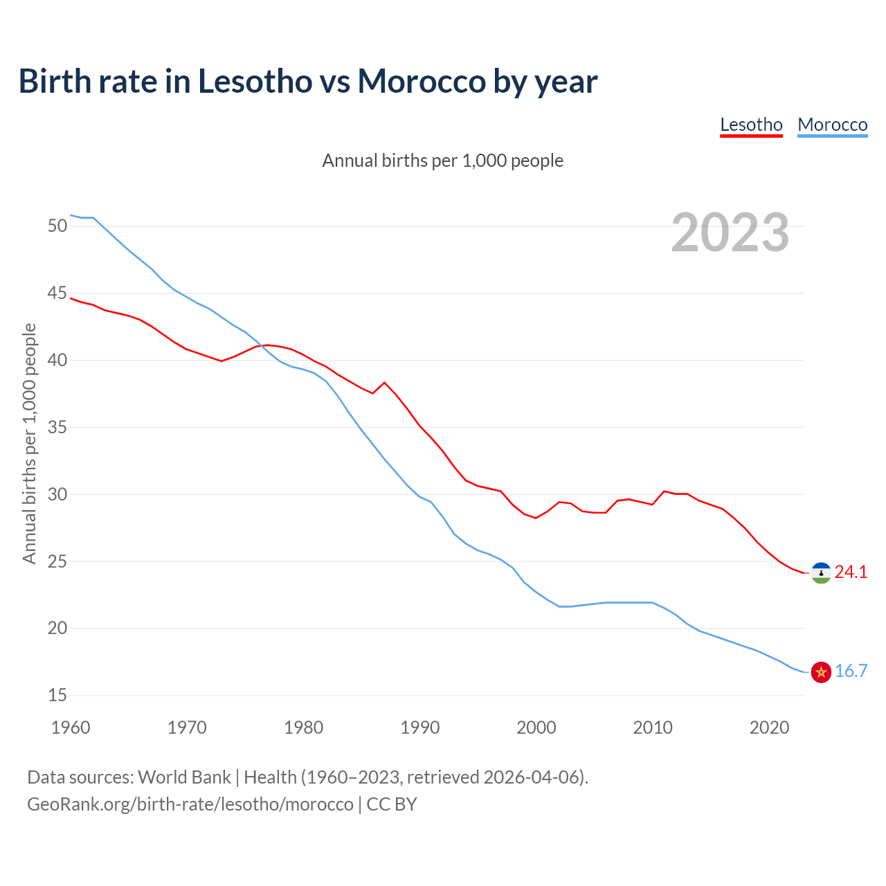 Lesotho has an annual birth rate of 24.1 births per 1,000 people, compared to 16.7 for Morocco. The average number of children a woman is expected to have during her lifetime — the fertility rate, is 2.69 in Lesotho and 2.23 in Morocco — 17.2% difference.