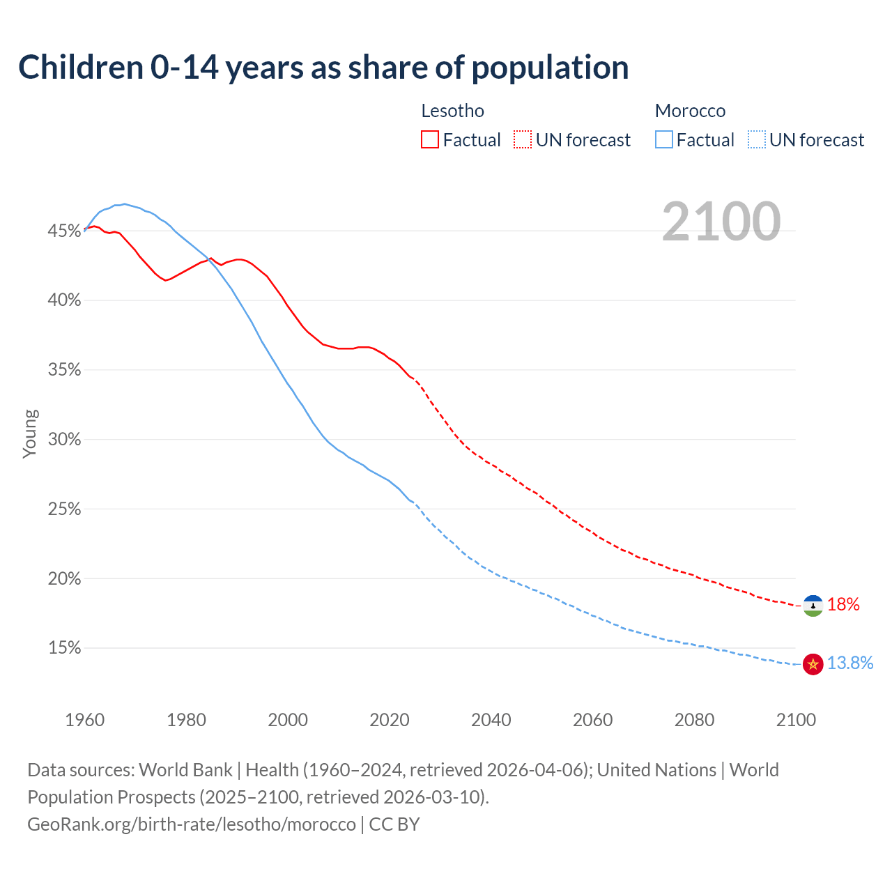 According to the latest available data on birth rates, the fertility rate in Lesotho was 2.69 children per woman in 2023, compared to 2.23 in Morocco in 2023. The replacement level is considered to be 2.1 children per woman.