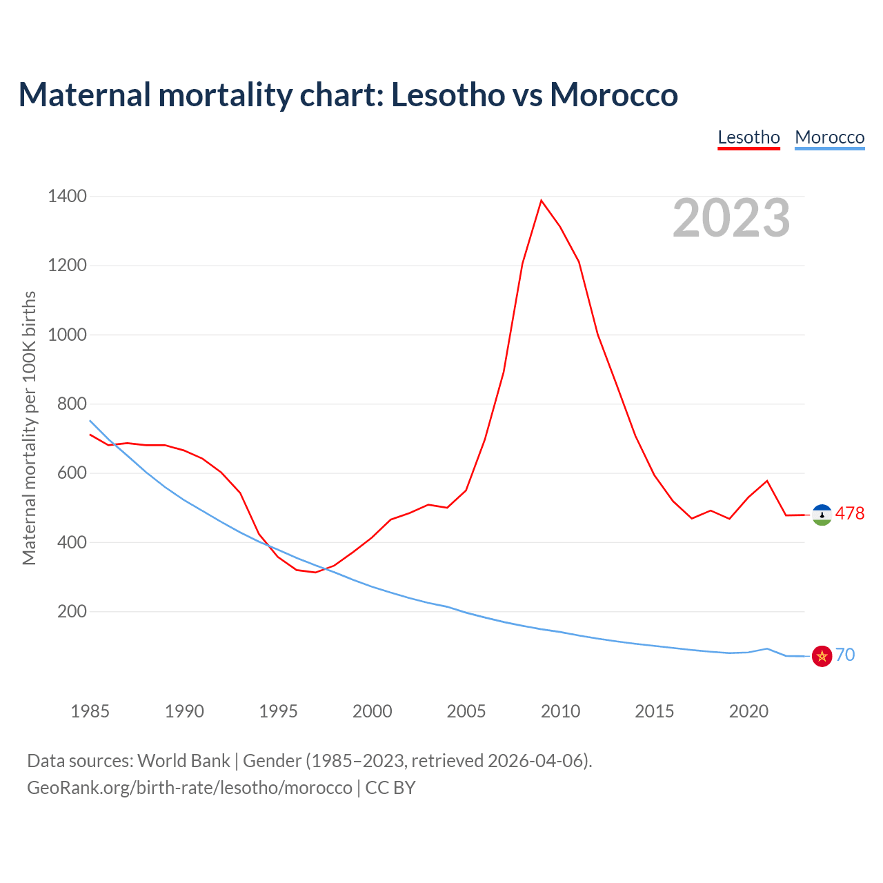 The maternal mortality rate, which is the probability of dying during childbirth or within 42 days of pregnancy termination, is 478 deaths per 100,000 live births in Lesotho, compared to 70 deaths in Morocco.