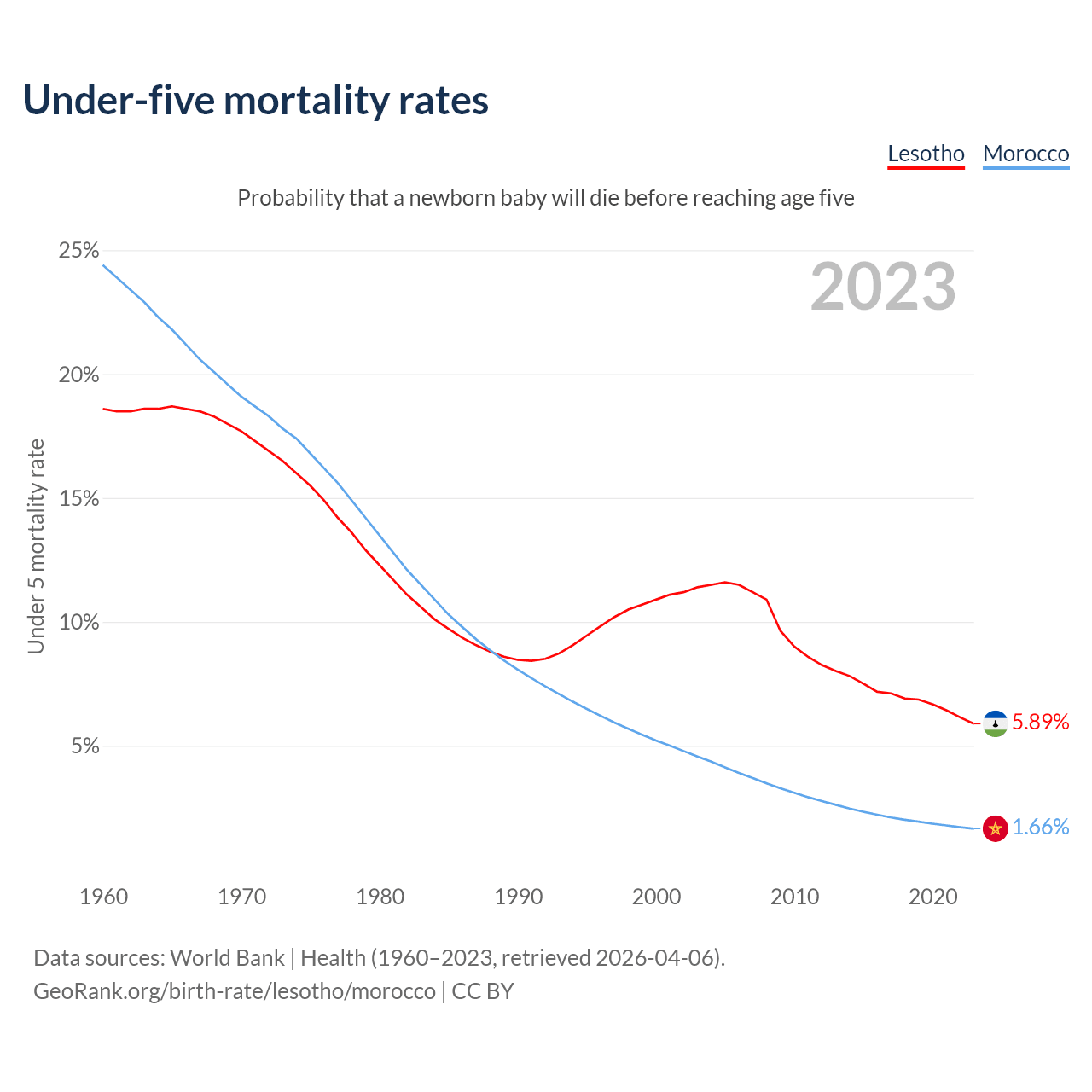 The chance that a newborn baby will die before reaching age five is 5.89% in Lesotho and 1.66% in Morocco. Above is a chart with historical data on under-five mortality rates.