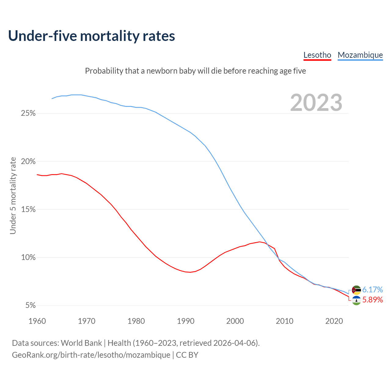 The chance that a newborn baby will die before reaching age five is 5.89% in Lesotho and 6.17% in Mozambique. Above is a chart with historical data on under-five mortality rates.