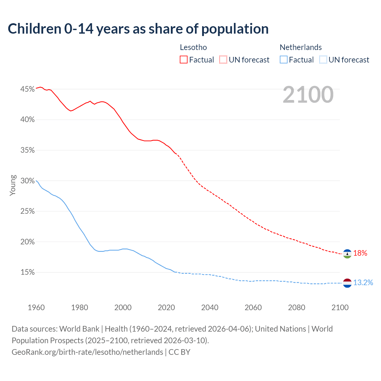 According to the latest available data on birth rates, the fertility rate in Lesotho was 2.69 children per woman in 2023, compared to 1.43 in the Netherlands in 2023. The replacement level is considered to be 2.1 children per woman.