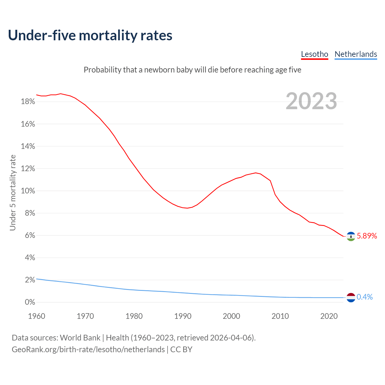 The chance that a newborn baby will die before reaching age five is 5.89% in Lesotho and 0.4% in the Netherlands. Above is a chart with historical data on under-five mortality rates.