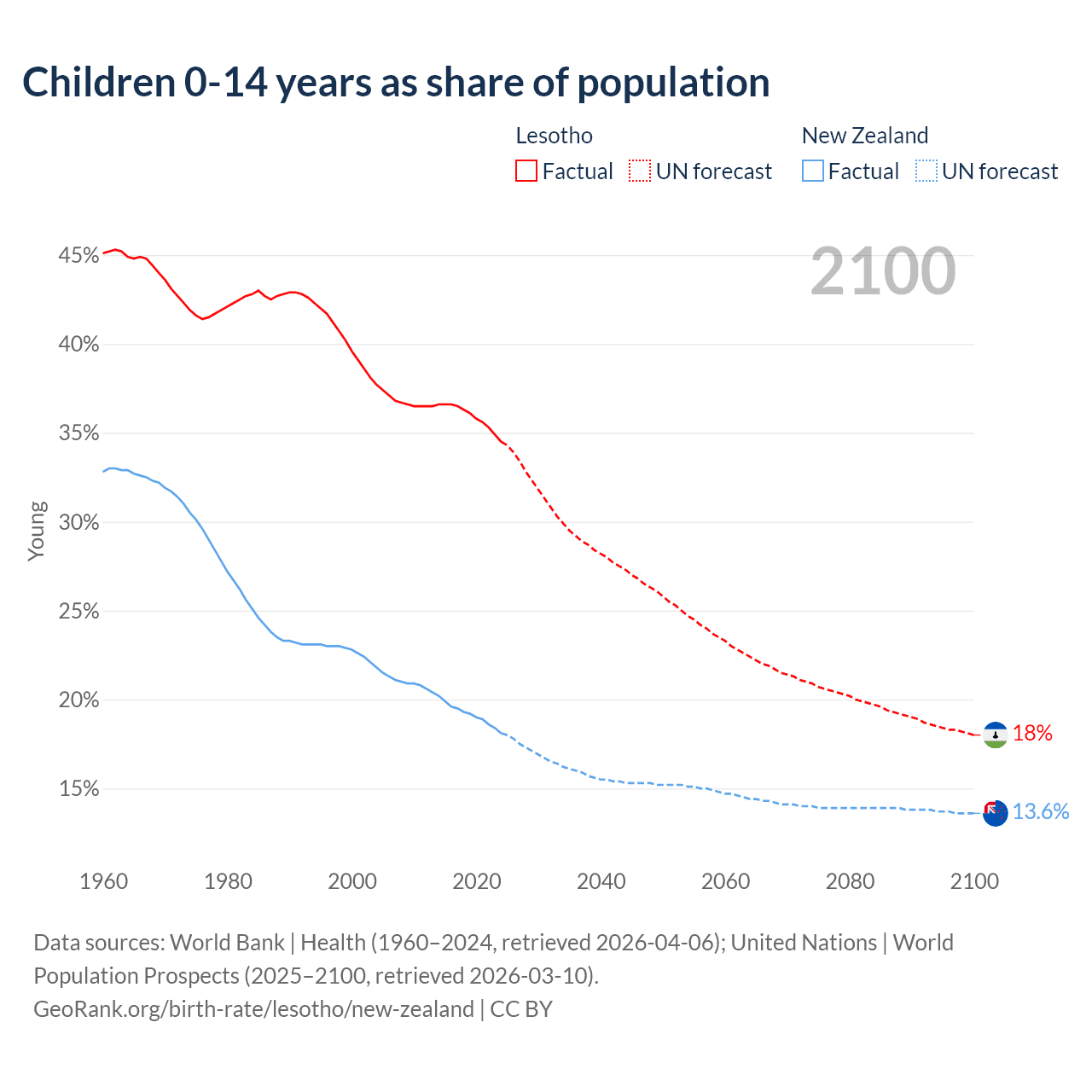 According to the latest available data on birth rates, the fertility rate in Lesotho was 2.69 children per woman in 2023, compared to 1.56 in New Zealand in 2023. The replacement level is considered to be 2.1 children per woman.