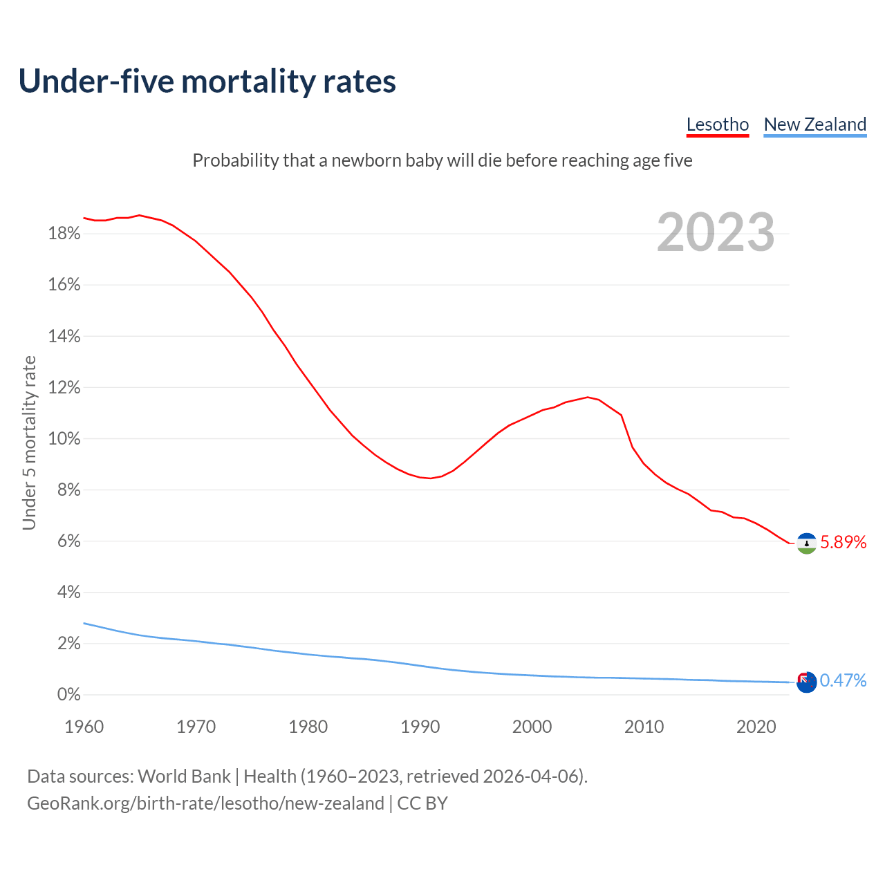 The chance that a newborn baby will die before reaching age five is 5.89% in Lesotho and 0.47% in New Zealand. Above is a chart with historical data on under-five mortality rates.