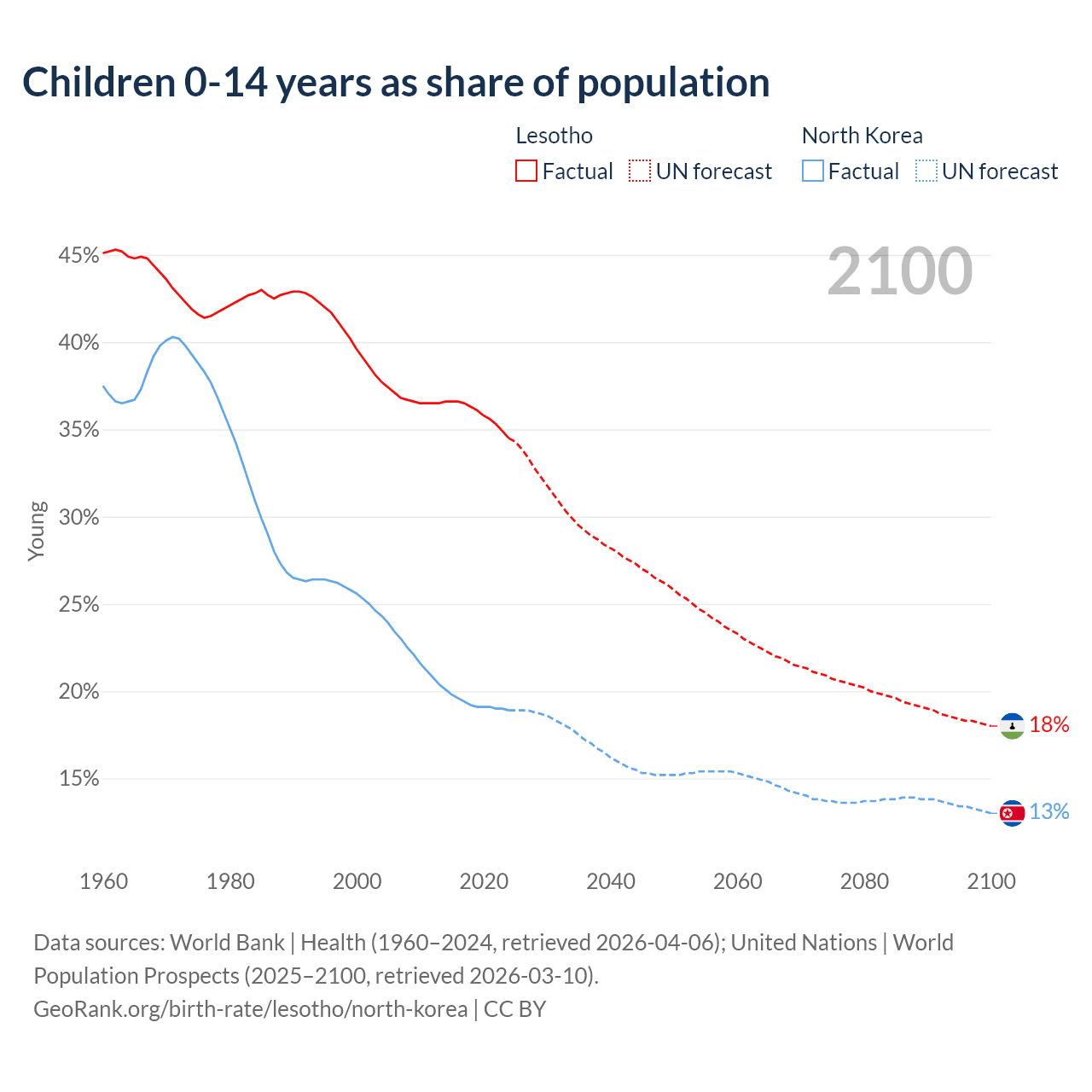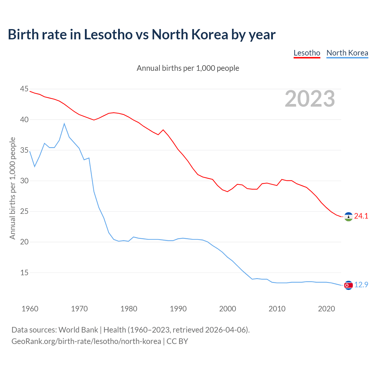 Lesotho has an annual birth rate of 24.1 births per 1,000 people, compared to 12.9 for North Korea. The average number of children a woman is expected to have during her lifetime — the fertility rate, is 2.69 in Lesotho and 1.78 in North Korea — 33.9% difference.
