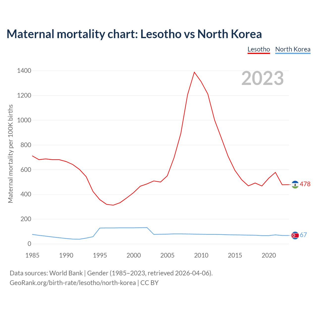 The maternal mortality rate, which is the probability of dying during childbirth or within 42 days of pregnancy termination, is 478 deaths per 100,000 live births in Lesotho, compared to 67 deaths in North Korea.