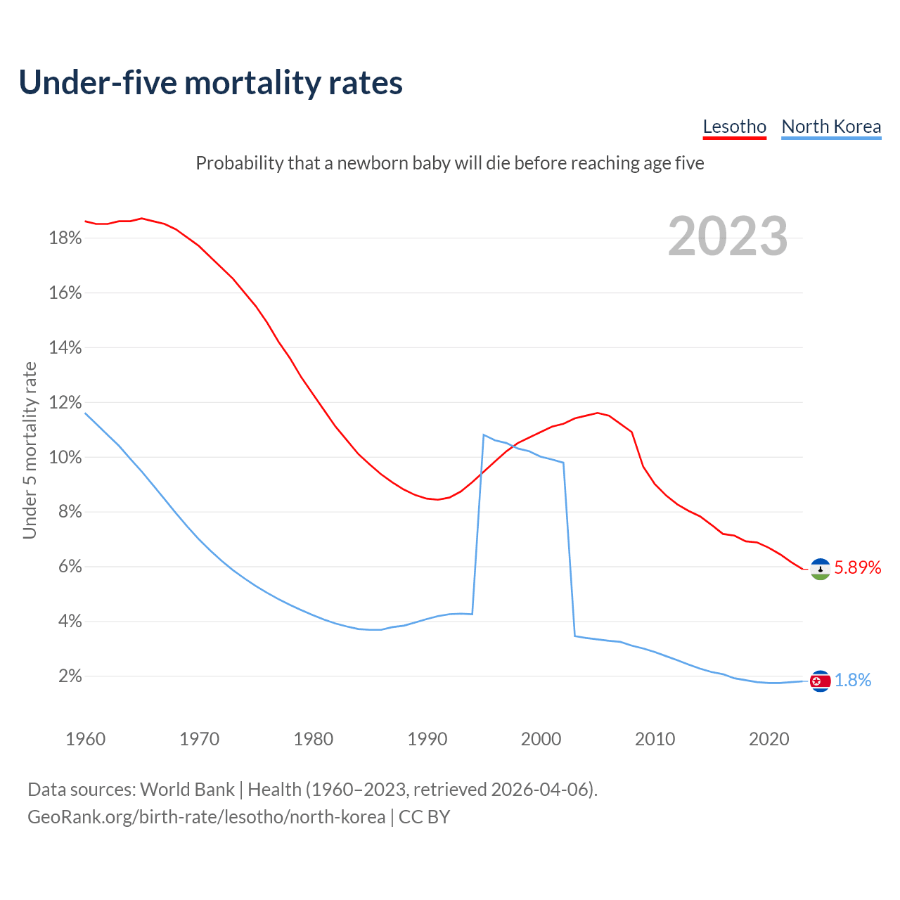 The chance that a newborn baby will die before reaching age five is 5.89% in Lesotho and 1.8% in North Korea. Above is a chart with historical data on under-five mortality rates.