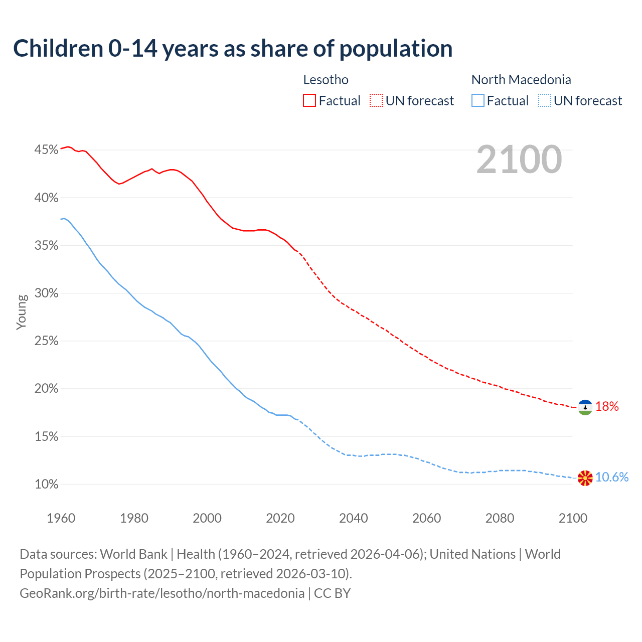 According to the latest available data on birth rates, the fertility rate in Lesotho was 2.69 children per woman in 2023, compared to 1.5 in North Macedonia in 2023. The replacement level is considered to be 2.1 children per woman.