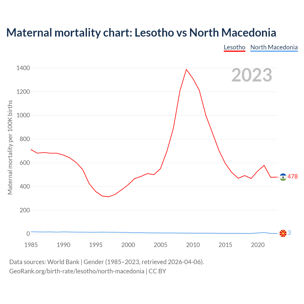The maternal mortality rate, which is the probability of dying during childbirth or within 42 days of pregnancy termination, is 478 deaths per 100,000 live births in Lesotho, compared to 3 deaths in North Macedonia.