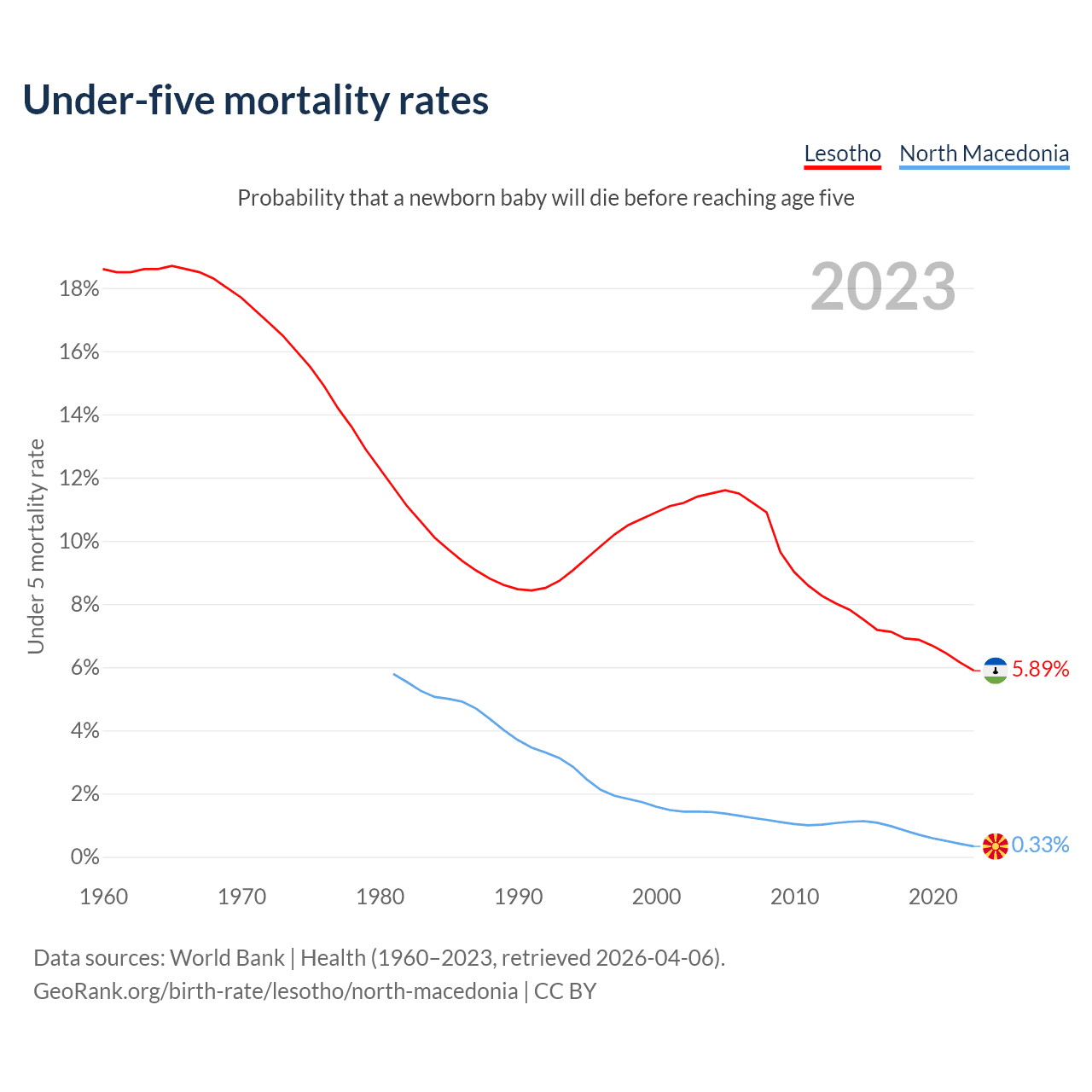 The chance that a newborn baby will die before reaching age five is 5.89% in Lesotho and 0.33% in North Macedonia. Above is a chart with historical data on under-five mortality rates.
