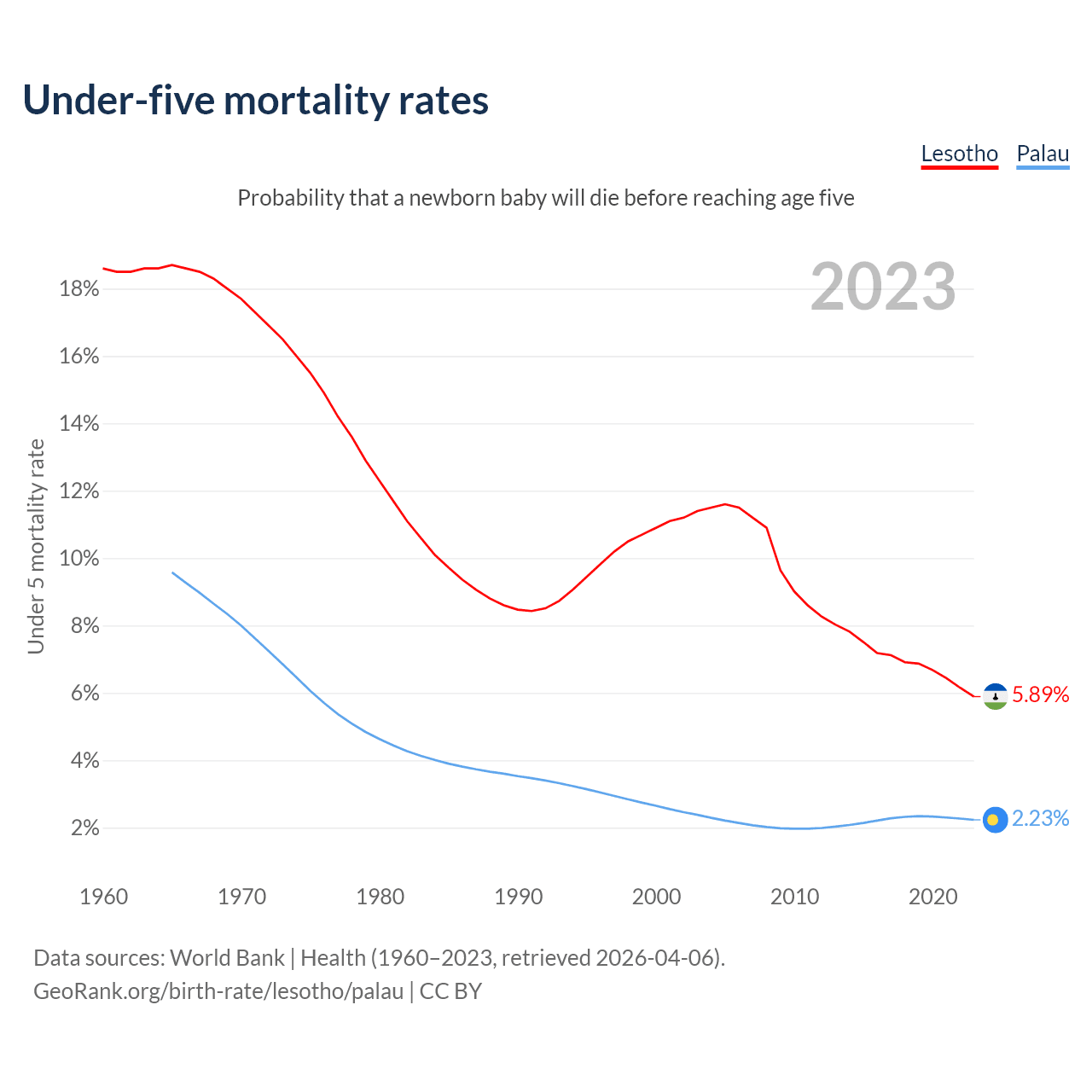 The chance that a newborn baby will die before reaching age five is 5.89% in Lesotho and 2.23% in Palau. Above is a chart with historical data on under-five mortality rates.