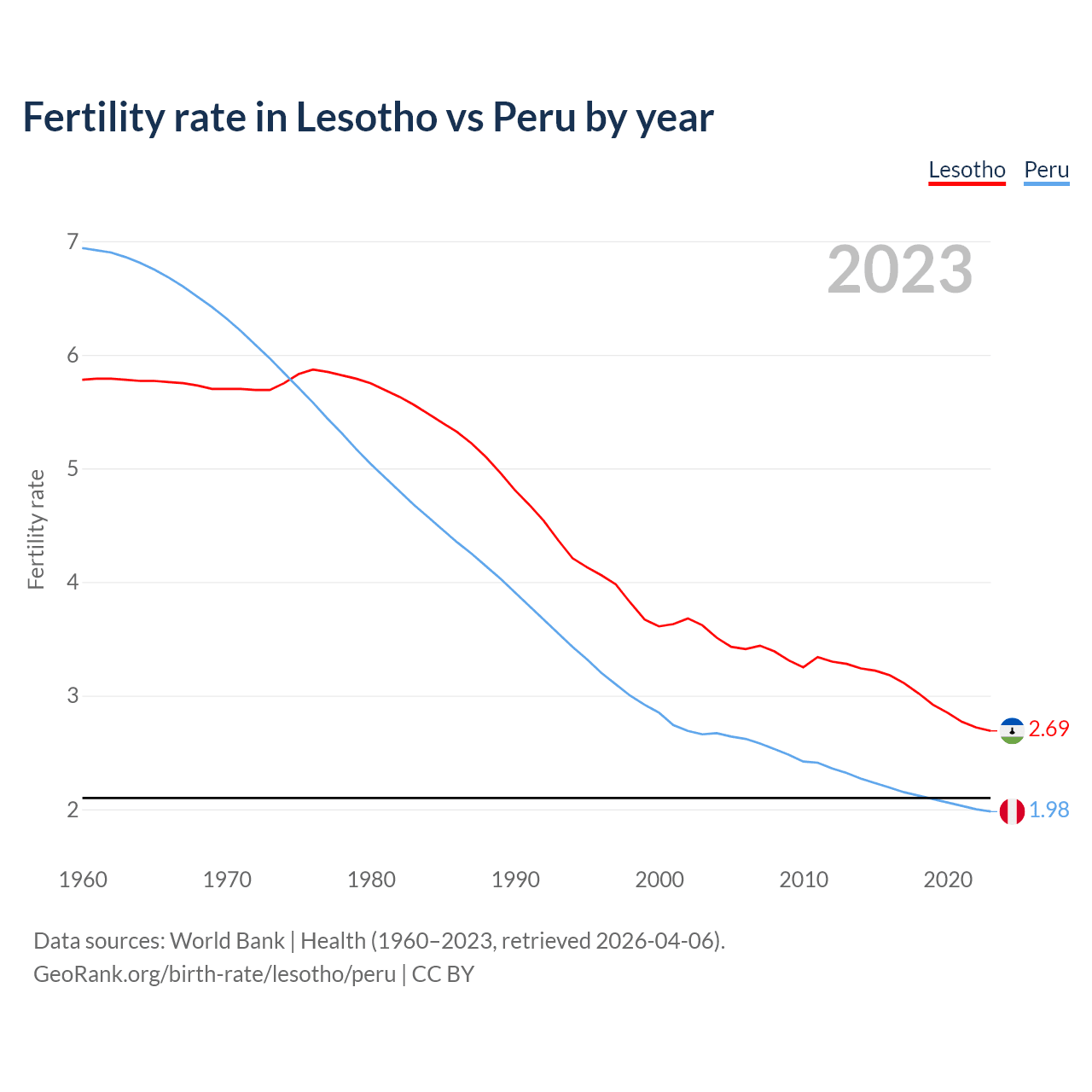 According to the latest available data on birth rates, the fertility rate in Lesotho was 2.69 children per woman in 2023, compared to 1.98 in Peru in 2023. The replacement level is considered to be 2.1 children per woman.