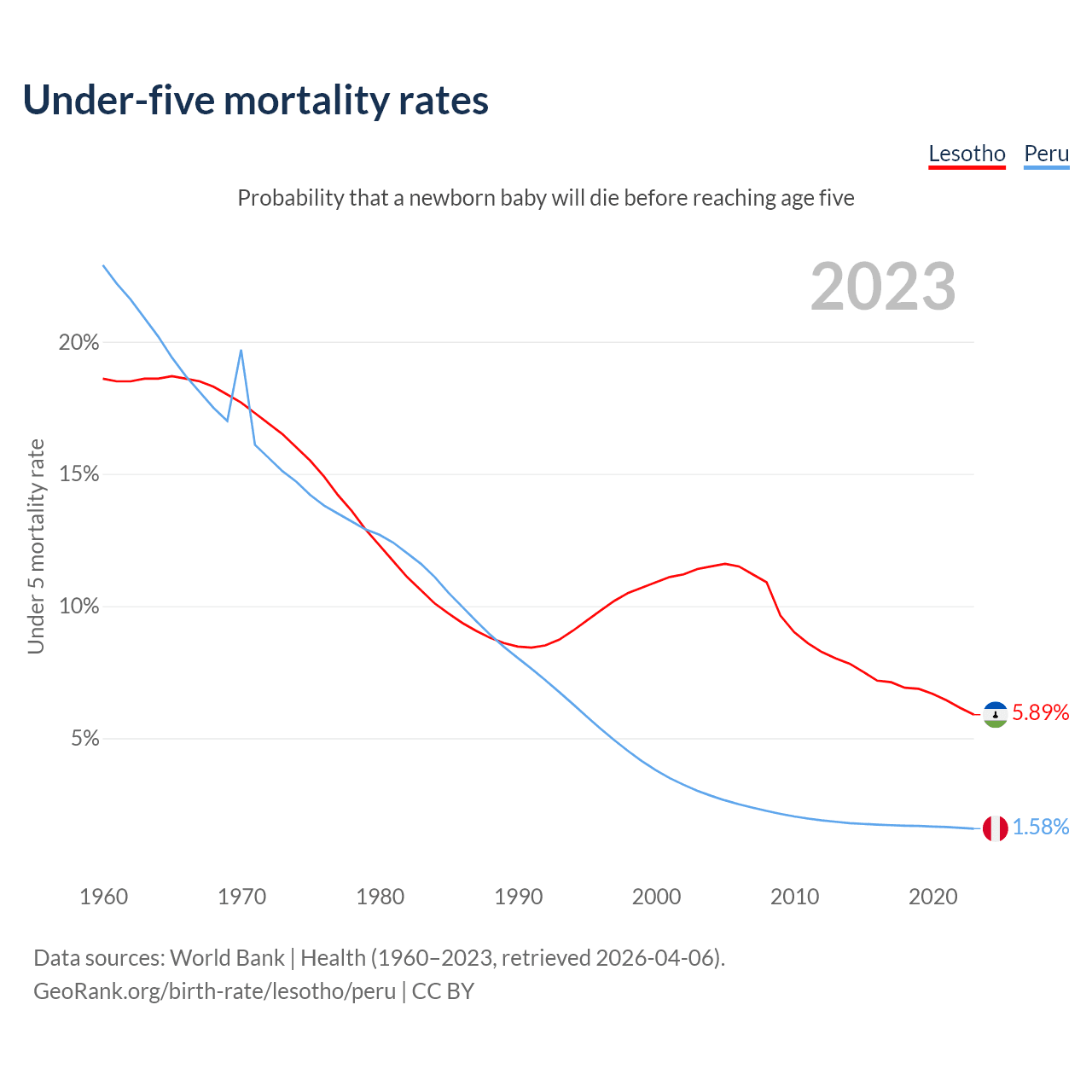 The chance that a newborn baby will die before reaching age five is 5.89% in Lesotho and 1.58% in Peru. Above is a chart with historical data on under-five mortality rates.