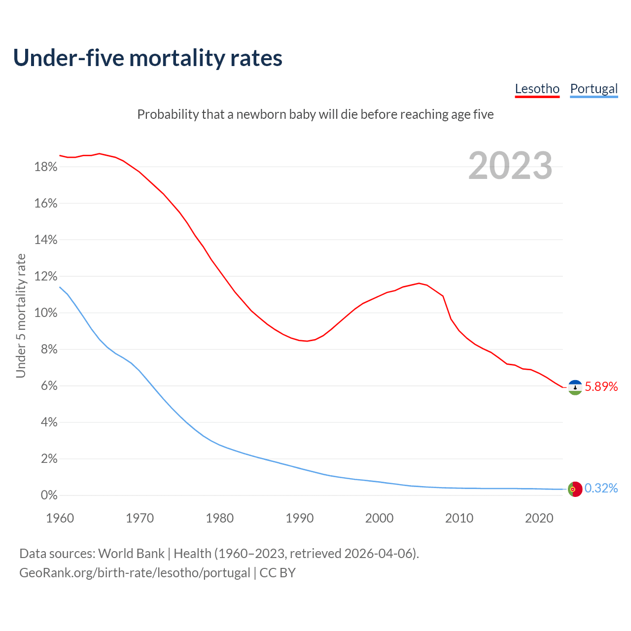The chance that a newborn baby will die before reaching age five is 5.89% in Lesotho and 0.32% in Portugal. Above is a chart with historical data on under-five mortality rates.
