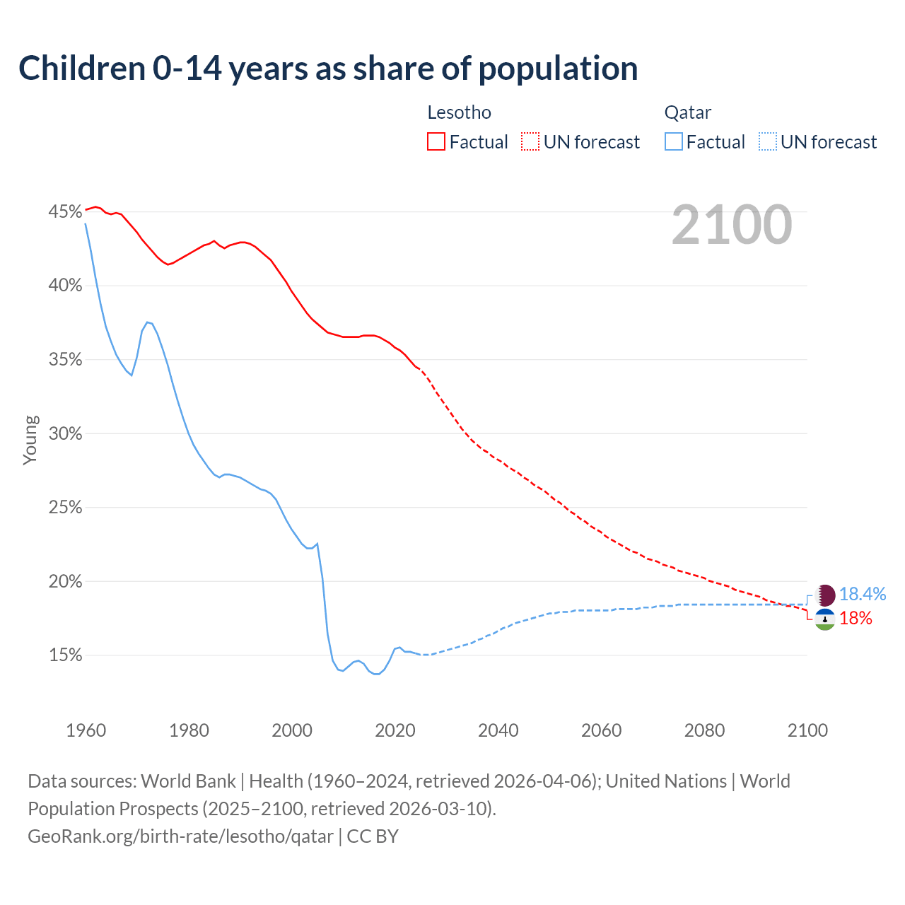 Lesotho has an annual birth rate of 24.1 births per 1,000 people, compared to 9.91 for Qatar. The average number of children a woman is expected to have during her lifetime — the fertility rate, is 2.69 in Lesotho and 1.73 in Qatar — 35.8% difference.