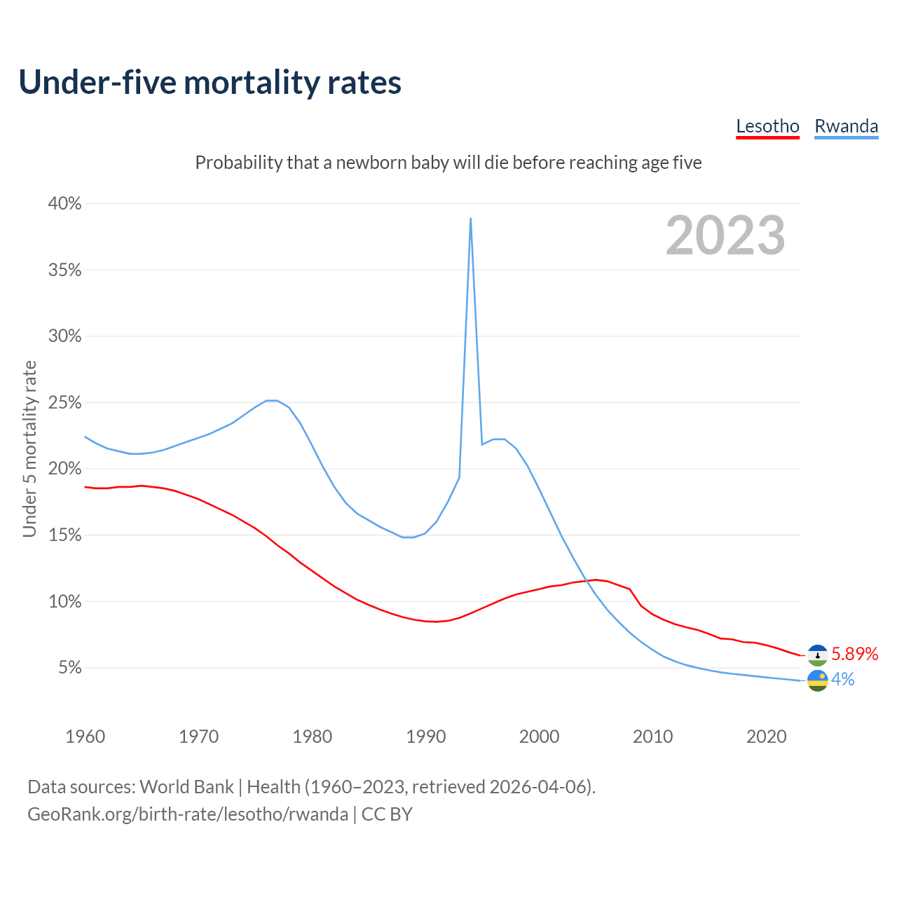 The chance that a newborn baby will die before reaching age five is 5.89% in Lesotho and 4% in Rwanda. Above is a chart with historical data on under-five mortality rates.