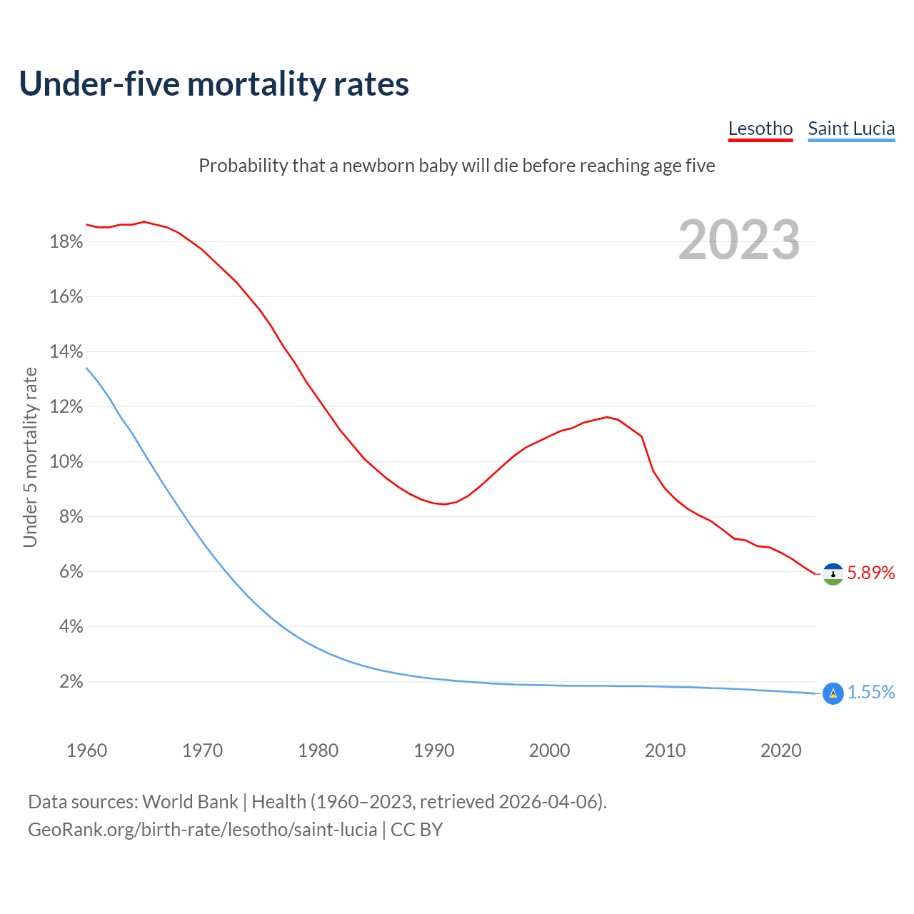 The chance that a newborn baby will die before reaching age five is 5.89% in Lesotho and 1.55% in Saint Lucia. Above is a chart with historical data on under-five mortality rates.