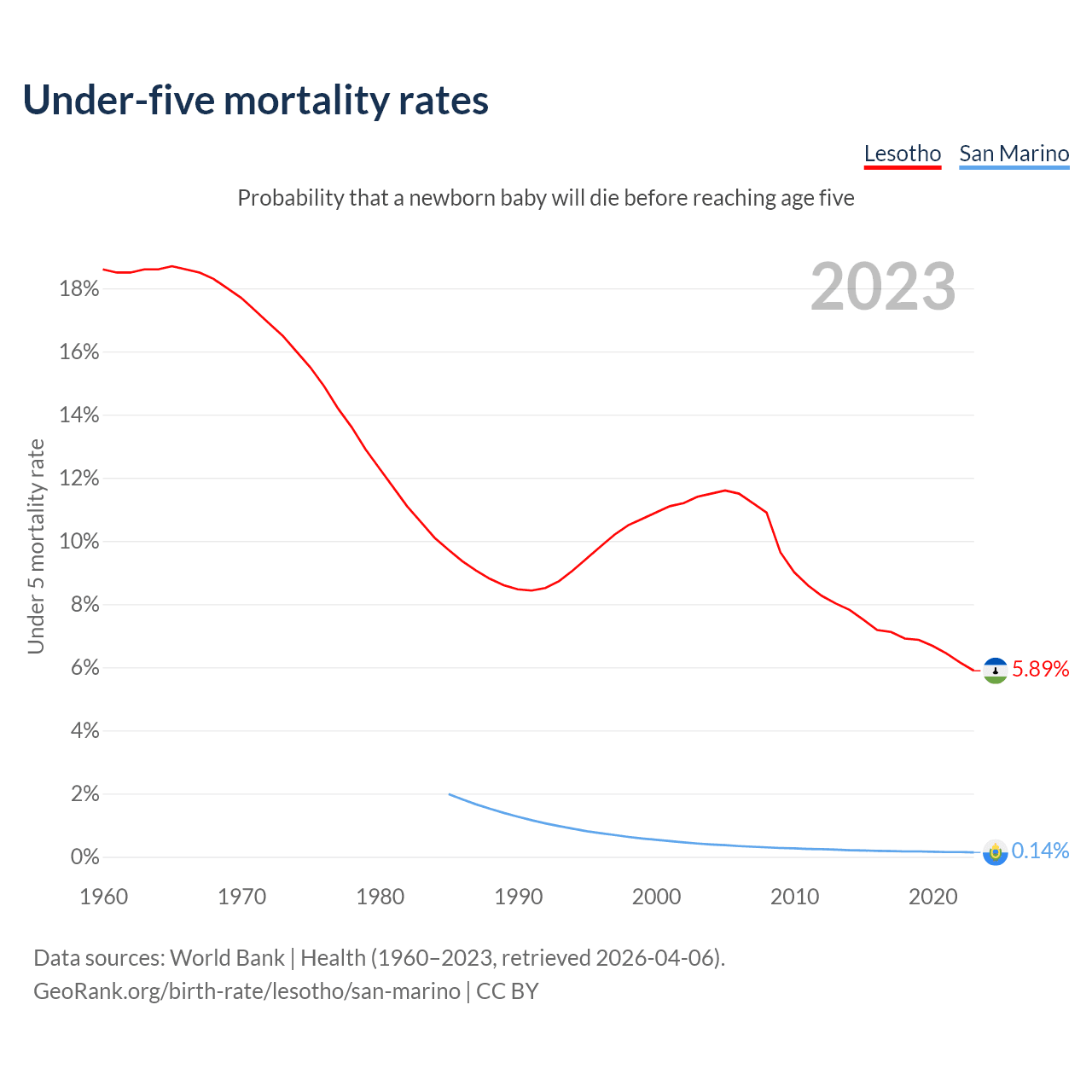 The chance that a newborn baby will die before reaching age five is 5.89% in Lesotho and 0.14% in San Marino. Above is a chart with historical data on under-five mortality rates.