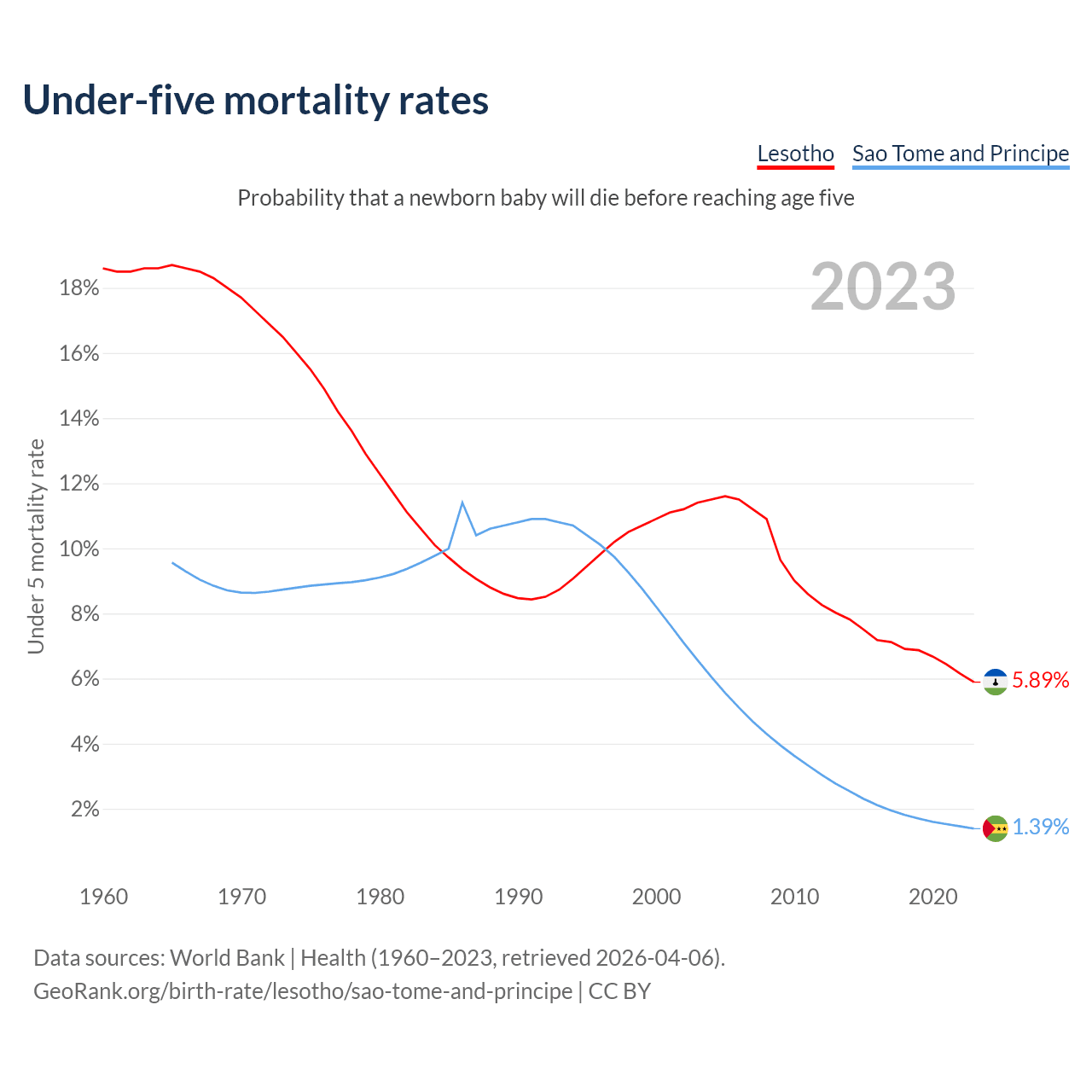 The chance that a newborn baby will die before reaching age five is 5.89% in Lesotho and 1.39% in Sao Tome and Principe. Above is a chart with historical data on under-five mortality rates.