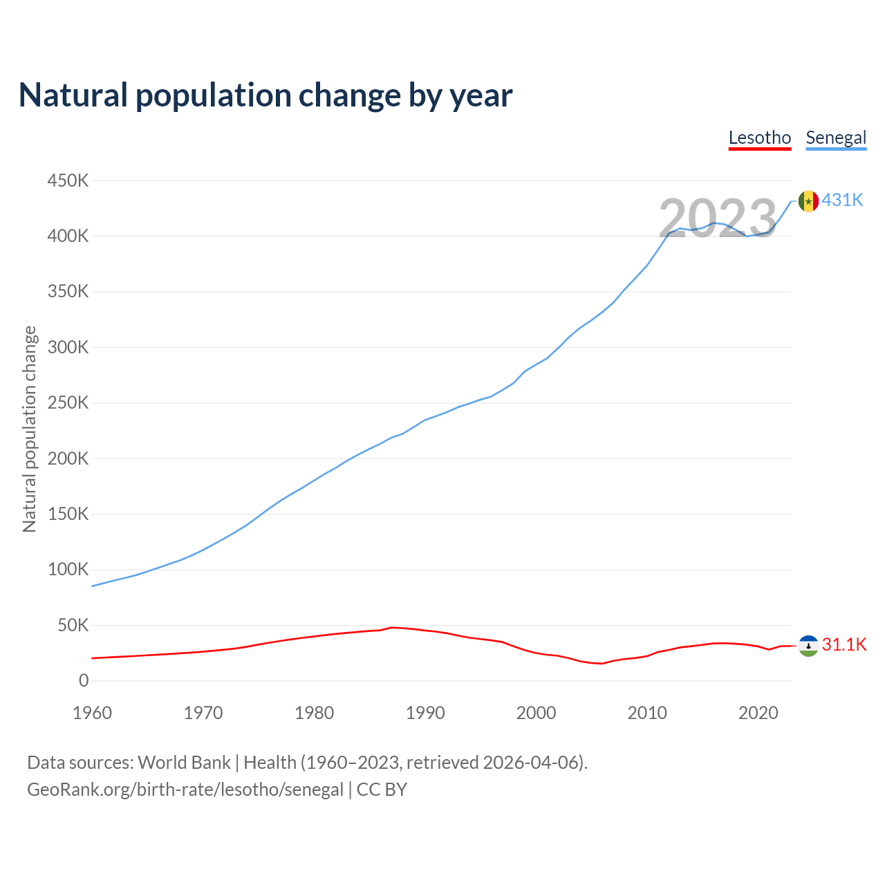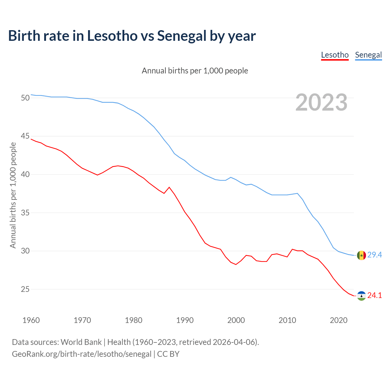 Lesotho has an annual birth rate of 24.1 births per 1,000 people, compared to 29.4 for Senegal. The average number of children a woman is expected to have during her lifetime — the fertility rate, is 2.69 in Lesotho and 3.82 in Senegal — 41.7% difference.
