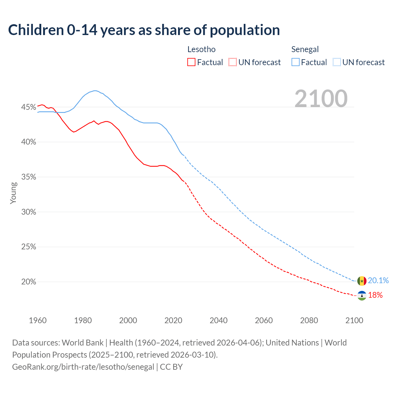 According to the latest available data on birth rates, the fertility rate in Lesotho was 2.69 children per woman in 2023, compared to 3.82 in Senegal in 2023. The replacement level is considered to be 2.1 children per woman.