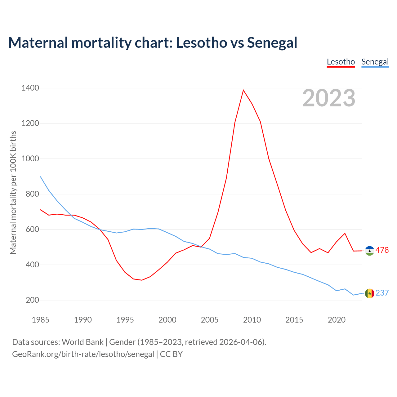 The maternal mortality rate, which is the probability of dying during childbirth or within 42 days of pregnancy termination, is 478 deaths per 100,000 live births in Lesotho, compared to 237 deaths in Senegal.