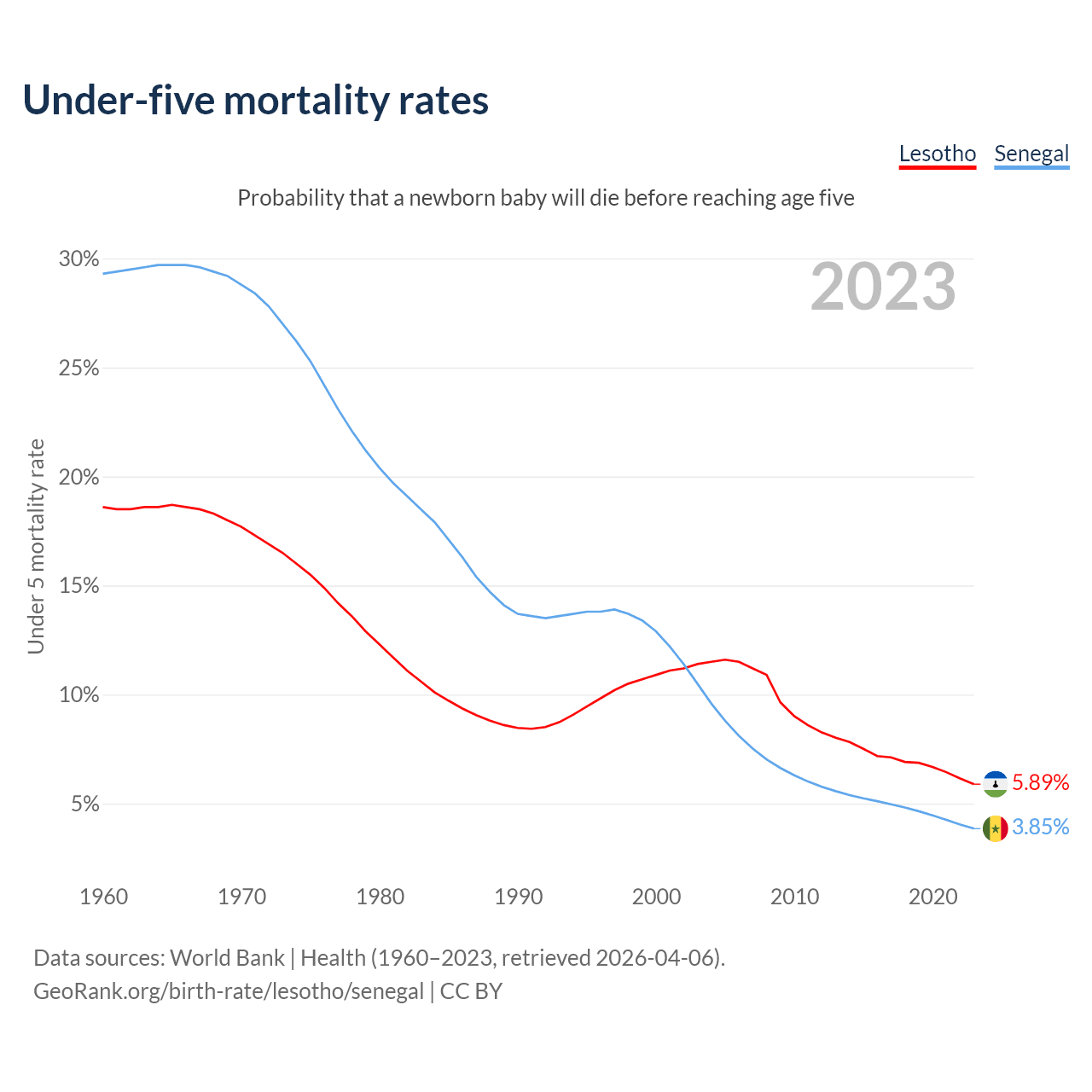 The chance that a newborn baby will die before reaching age five is 5.89% in Lesotho and 3.85% in Senegal. Above is a chart with historical data on under-five mortality rates.