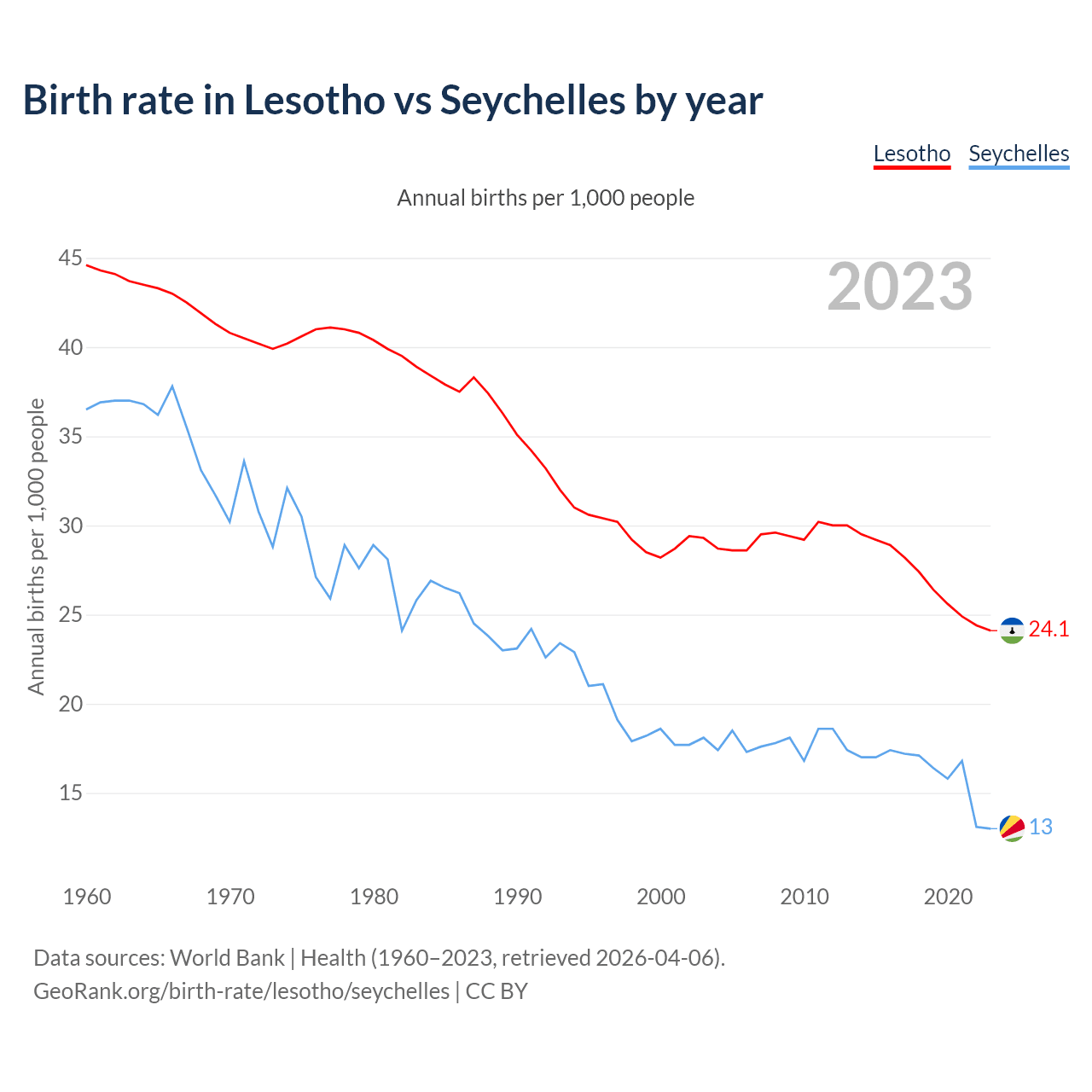 Lesotho has an annual birth rate of 24.1 births per 1,000 people, compared to 13 for the Seychelles. The average number of children a woman is expected to have during her lifetime — the fertility rate, is 2.69 in Lesotho and 2.02 in the Seychelles — 25% difference.
