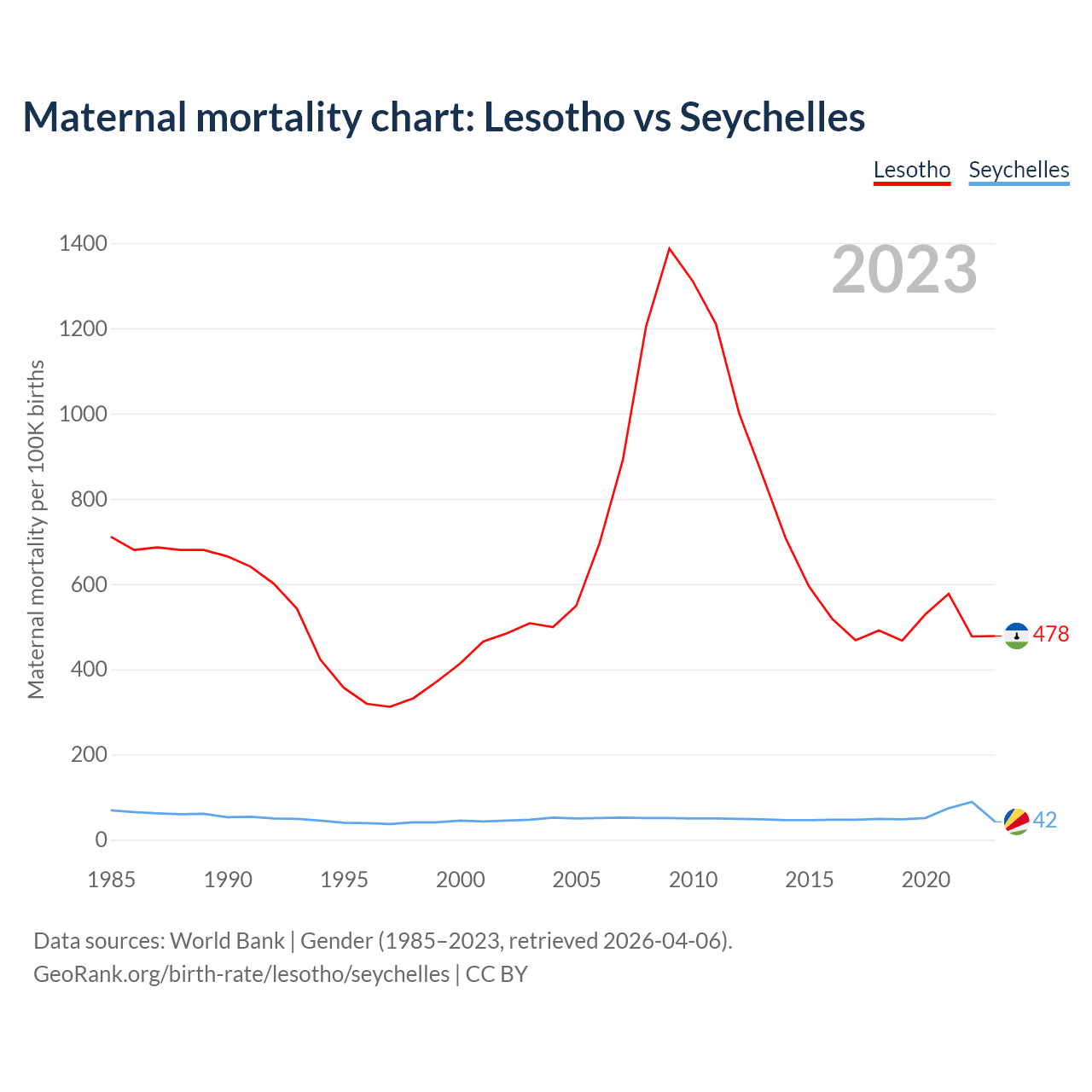 - Annual births per 1,000 women ages 15-19 (adolescent birth rate or teenage mother rate) is 70.6 in Lesotho vs 54.5 in the Seychelles.