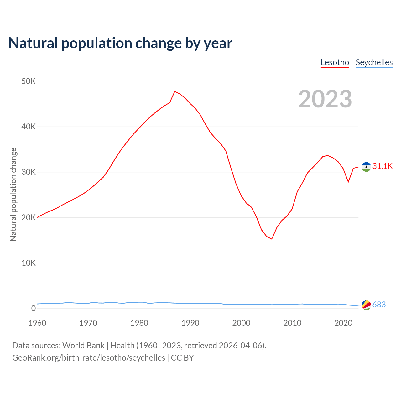 According to the latest available data on birth rates, the fertility rate in Lesotho was 2.69 children per woman in 2023, compared to 2.02 in the Seychelles in 2023. The replacement level is considered to be 2.1 children per woman.