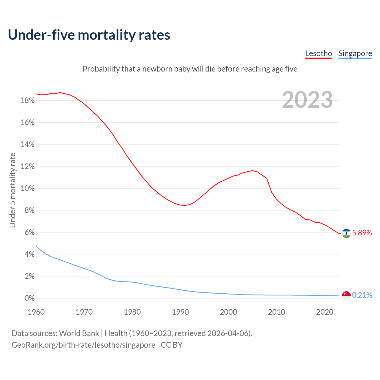 The chance that a newborn baby will die before reaching age five is 5.89% in Lesotho and 0.21% in Singapore. Above is a chart with historical data on under-five mortality rates.