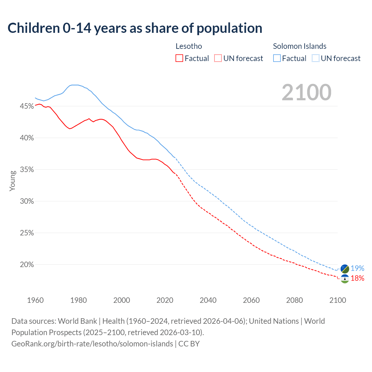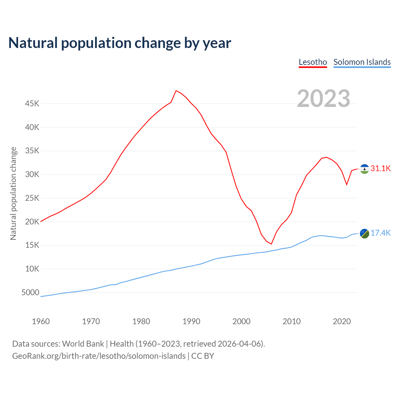 Lesotho has an annual birth rate of 24.1 births per 1,000 people, compared to 26.9 for the Solomon Islands. The average number of children a woman is expected to have during her lifetime — the fertility rate, is 2.69 in Lesotho and 3.56 in the Solomon Islands — 32% difference.