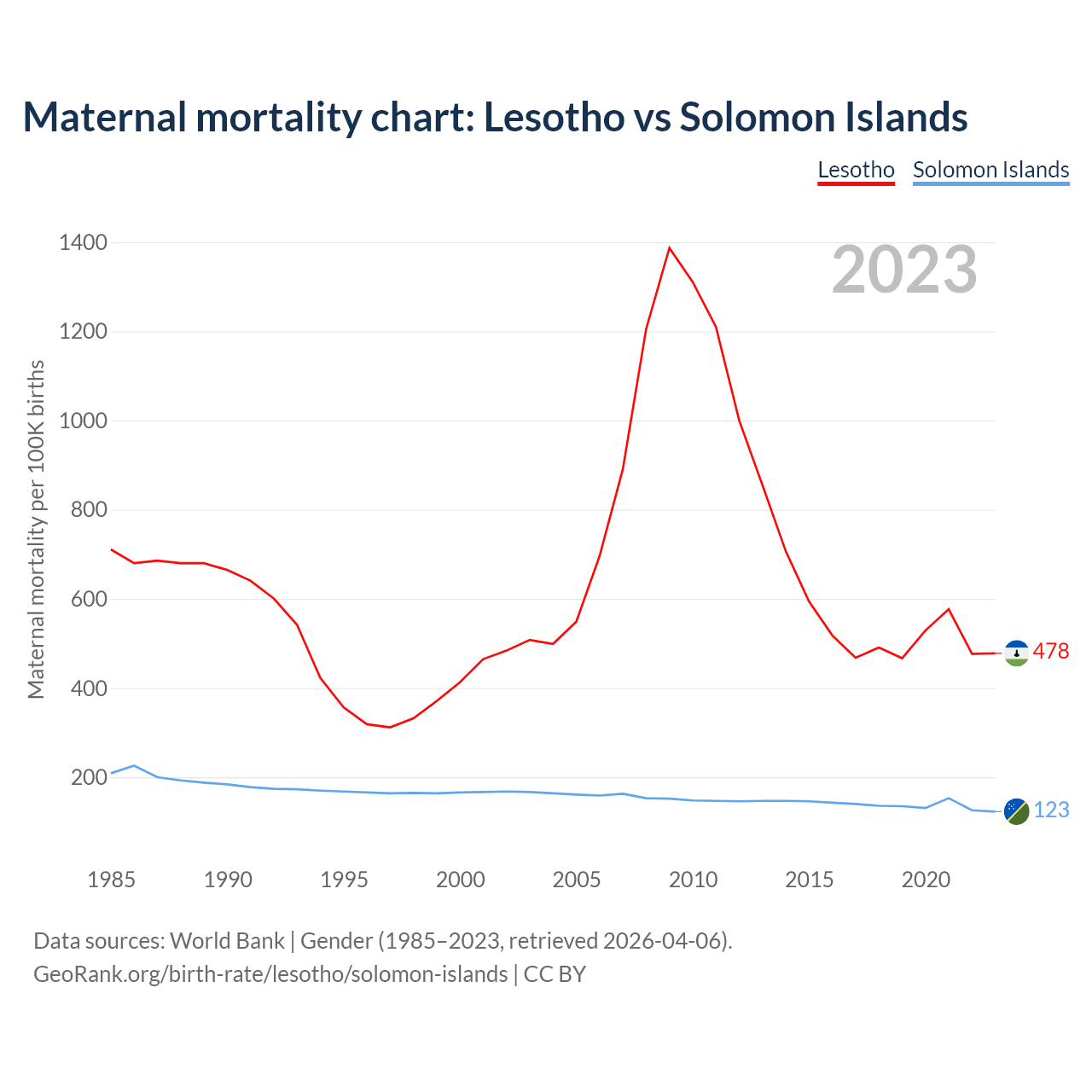 The maternal mortality rate, which is the probability of dying during childbirth or within 42 days of pregnancy termination, is 478 deaths per 100,000 live births in Lesotho, compared to 123 deaths in the Solomon Islands.